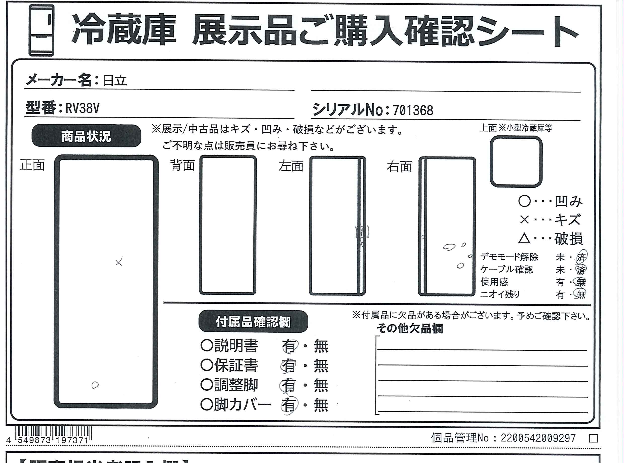 中古商品ランクについて 付属品・商品状態について 〔付属品〕説明書、調節脚×2、小物ケース、卵スタンド、給水タンク、脚カバー、製氷スコップ、蒸発皿