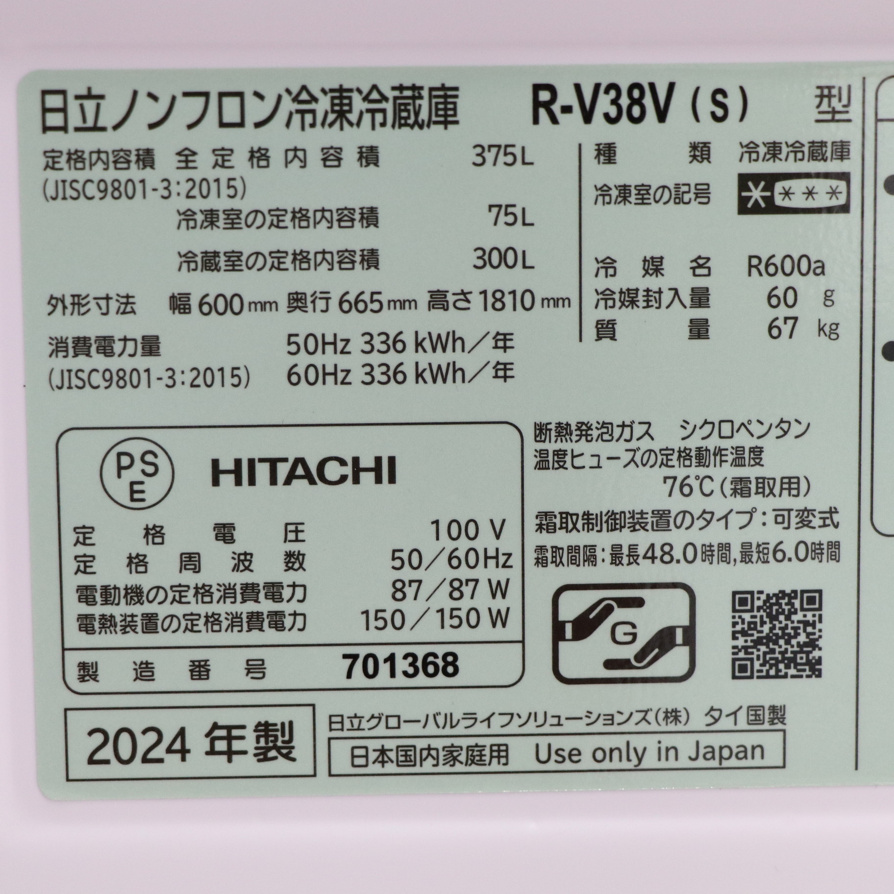 〔展示品〕 冷蔵庫 Vタイプ グラファイトシルバー R-V38V-S [幅60cm /375L /3ドア /右開きタイプ /2024年]