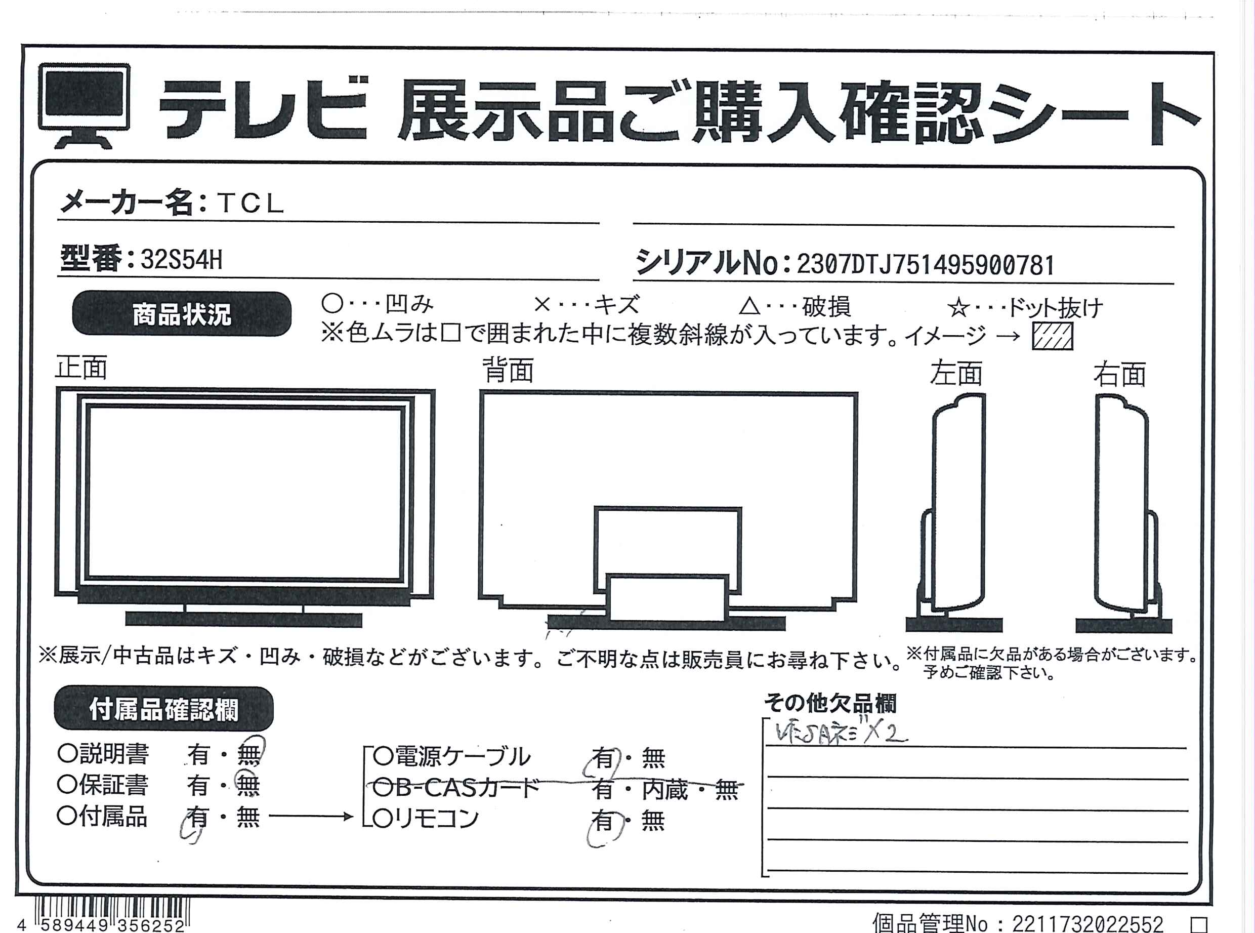 ![TCL(ティーシーエル) チューナーレステレビ S54Hシリーズ 32S54H [32V型 /Bluetooth対応 /フルハイビジョン /チューナーレス /YouTube対応] 【sof001】](https://image.sofmap.com/images/product/large/4589449356252.jpg)