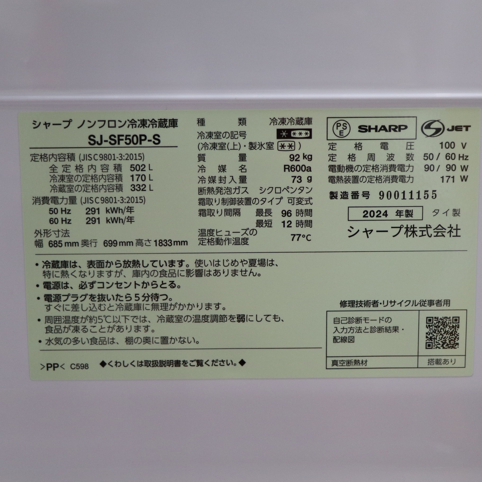 〔展示品〕 冷蔵庫 ステンレスシルバー SJ-SF50P-S [幅68.5cm /502L /6ドア /観音開きタイプ]