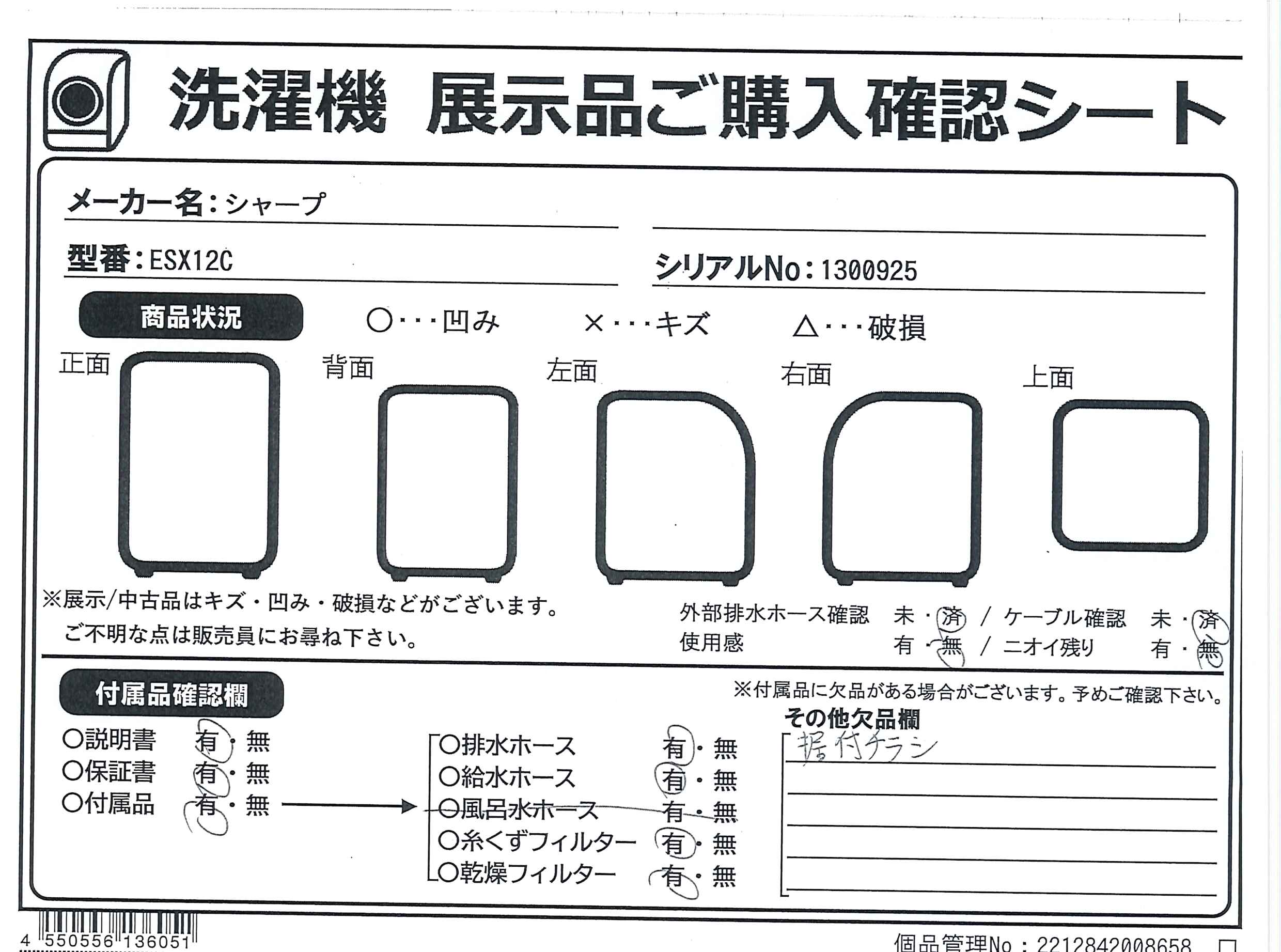 中古商品ランクについて 付属品・商品状態について 〔付属品〕取扱説明書、シャープクラウドサービスガイド、洗剤ご使用ガイド、洗濯キャップ、給水ホース、外部ホース、水準器、輸送用固定ねじ(上用×2・下用×2)、ビスシート(2枚入×2組)、水栓つぎて、ホースクリップ