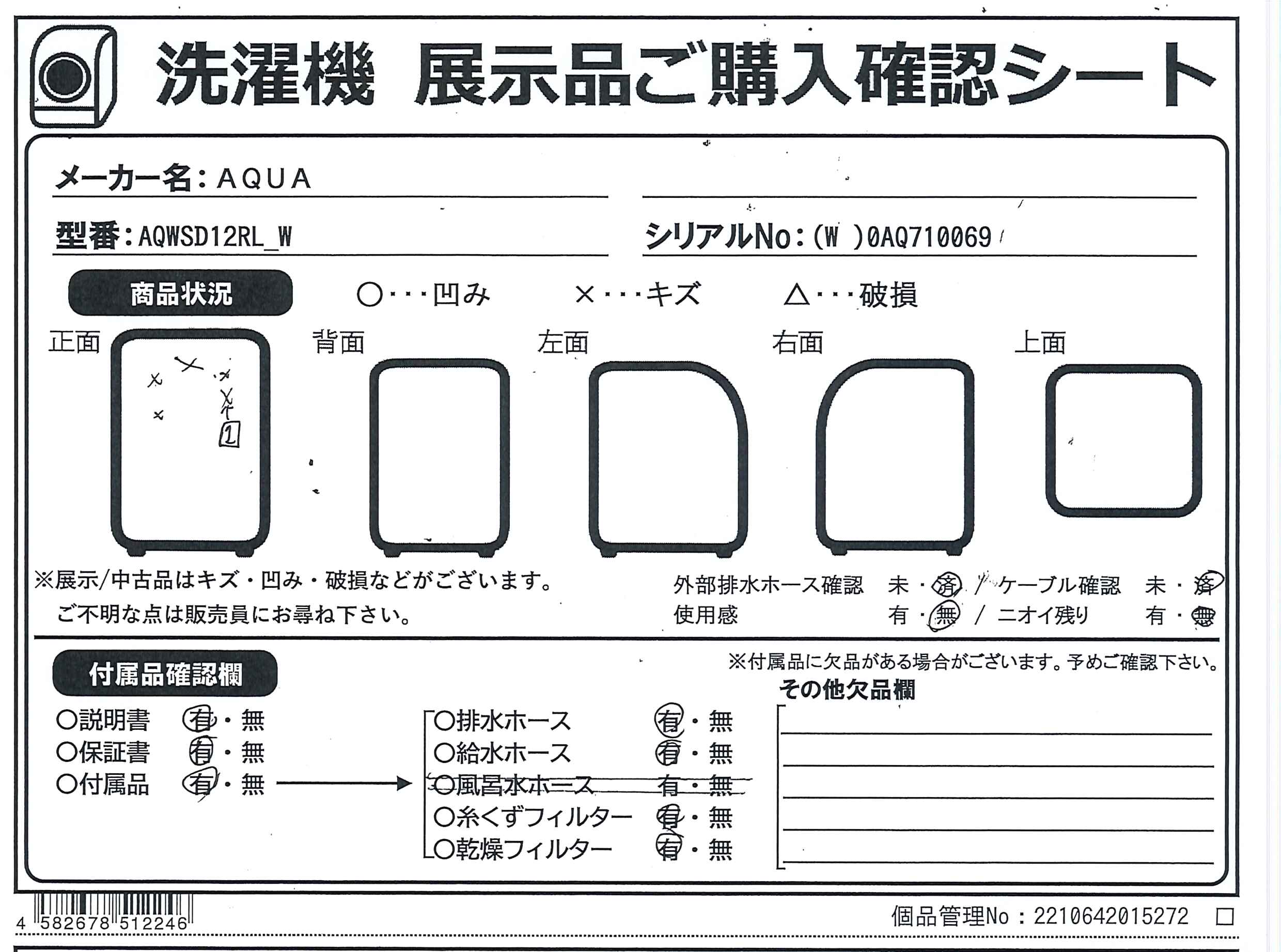中古商品ランクについて 付属品・商品状態について 〔付属品〕説明書、据付説明書、給水ホース、マジックつぎ手、キャップ×4、排水ホース(スリーブ付き)、排水ジョイントホース、ホースバンド、ストッパー、スパナ