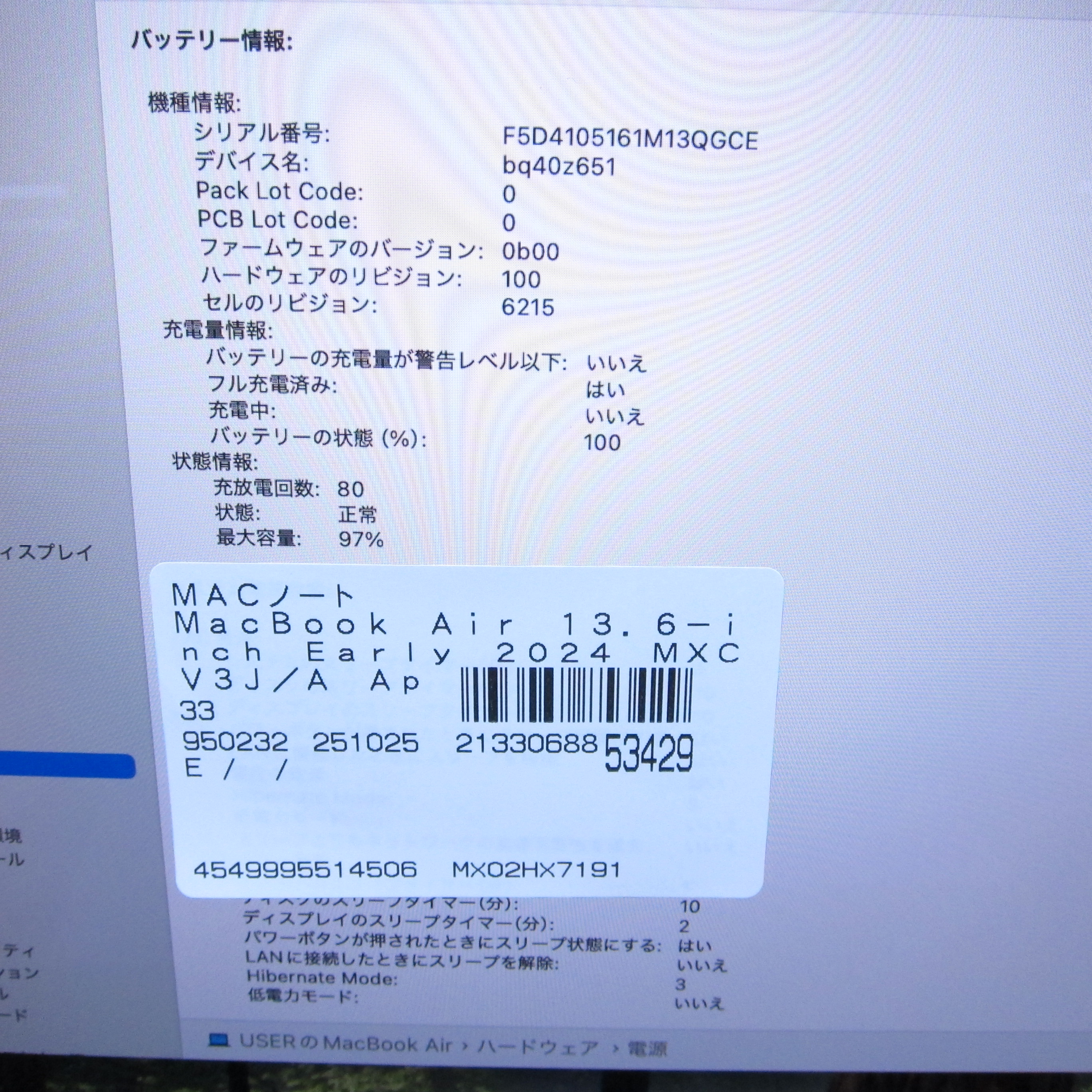 〔中古品〕 MacBook Air 13.6-inch Early-2024 MXCV3J/A Apple M3 8コアCPU_10コアGPU 16GB SSD512GB ミッドナイト 〔15.3 Sequoia〕 [グラフィック:オンボード/JISキーボード]