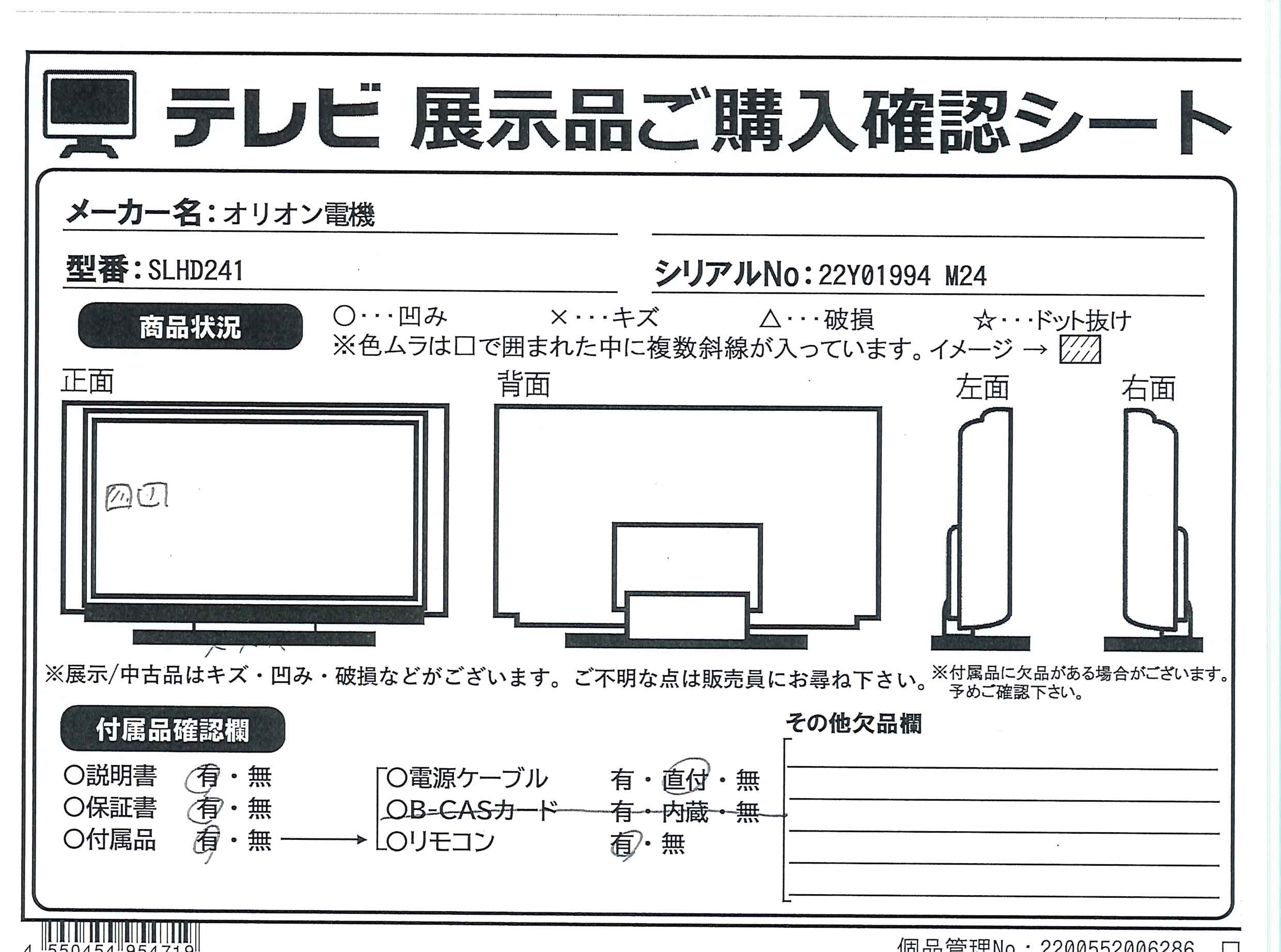 付属品 リモコン、スタンド、スタンド組立用ネジ、取説、保証書など