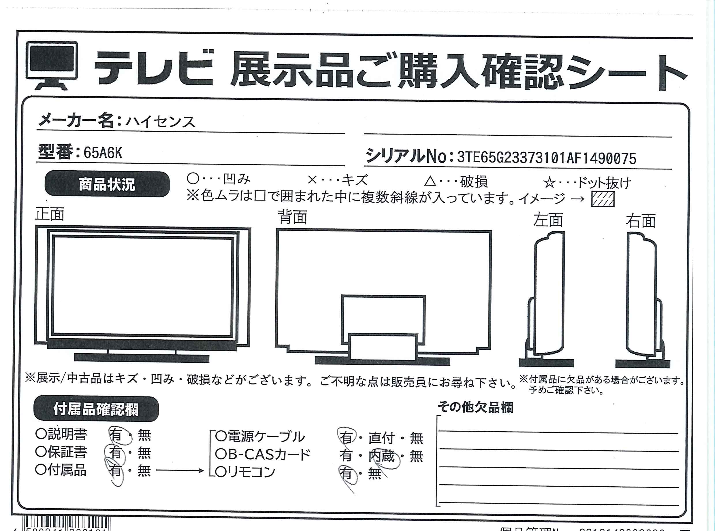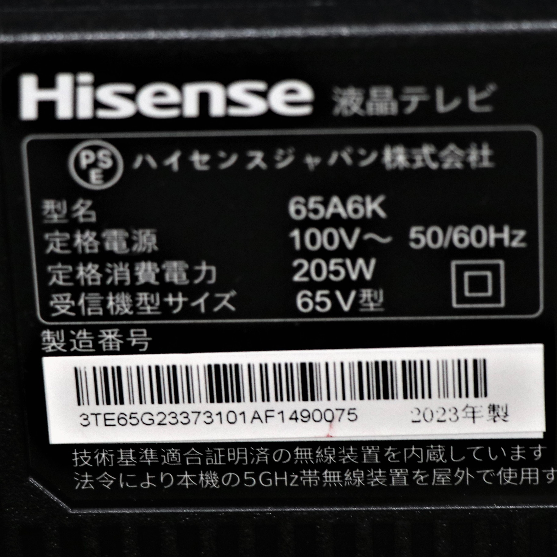 〔展示品〕 液晶テレビ 65A6K [65V型 /Bluetooth対応 /4K対応 /BS・CS 4Kチューナー内蔵 /YouTube対応]