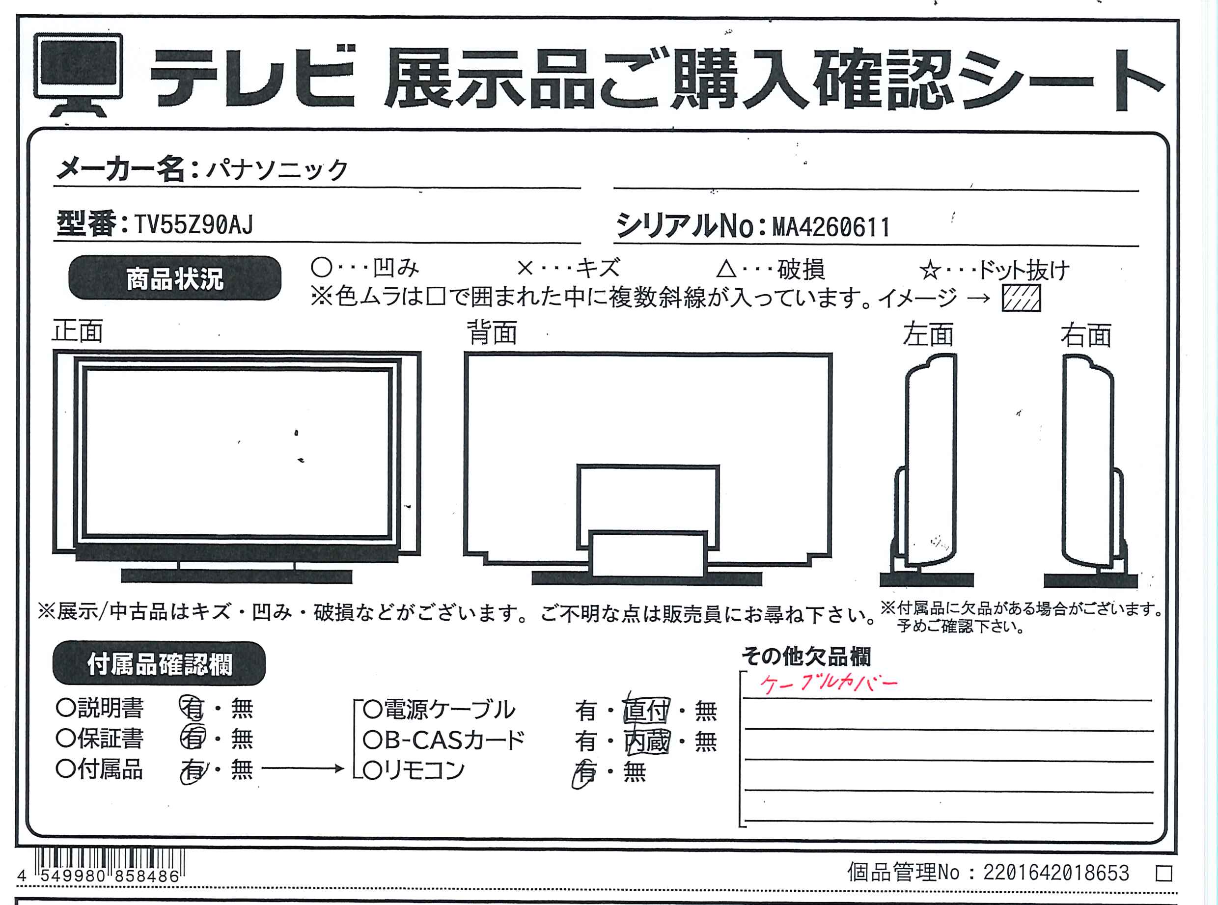 中古商品ランクについて 付属品・商品状態について 〔付属品〕取扱説明書、リモコン、リモコン用乾電池×2、転倒防止スタンド、本体固定用ねじ(M4)×4、転倒・落下防止部品一式