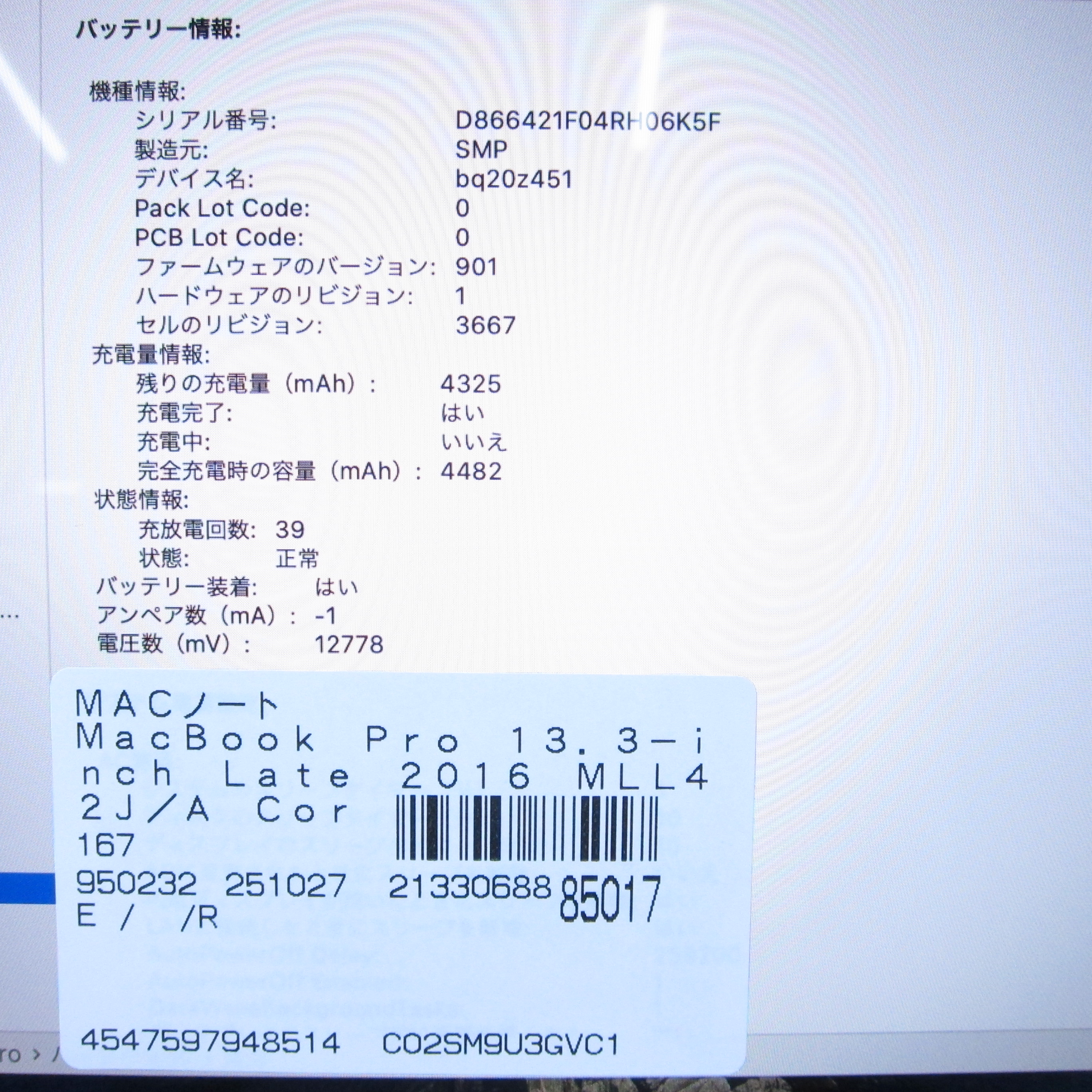 〔中古品〕 MacBook Pro 13.3-inch Late-2016 MLL42J/A Core_i5 2GHz 8GB SSD256GB スペースグレイ 〔10.15 Catalina〕 [グラフィック:Intel Iris Graphics 540(CPU内蔵)/JISキーボード]