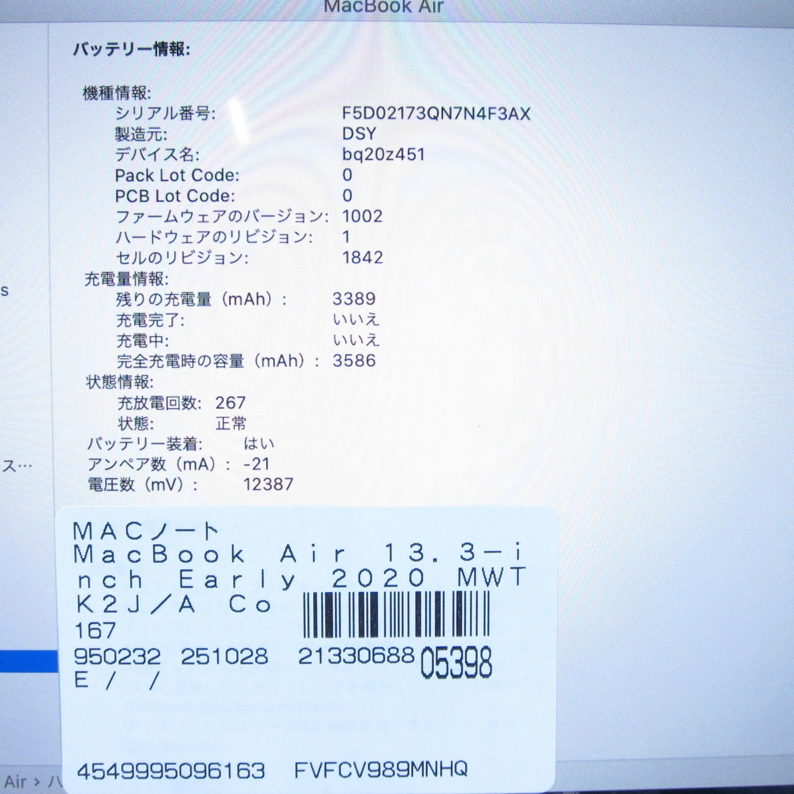 商品名 〔中古品〕 MacBook Air 13.3-inch Early-2020 MWTK2J/A Core_i3 1.1GHz 8GB SSD256GB シルバー 〔10.15 Catalina〕 [グラフィック:Intel Iris Plus Graphics/JISキーボード]