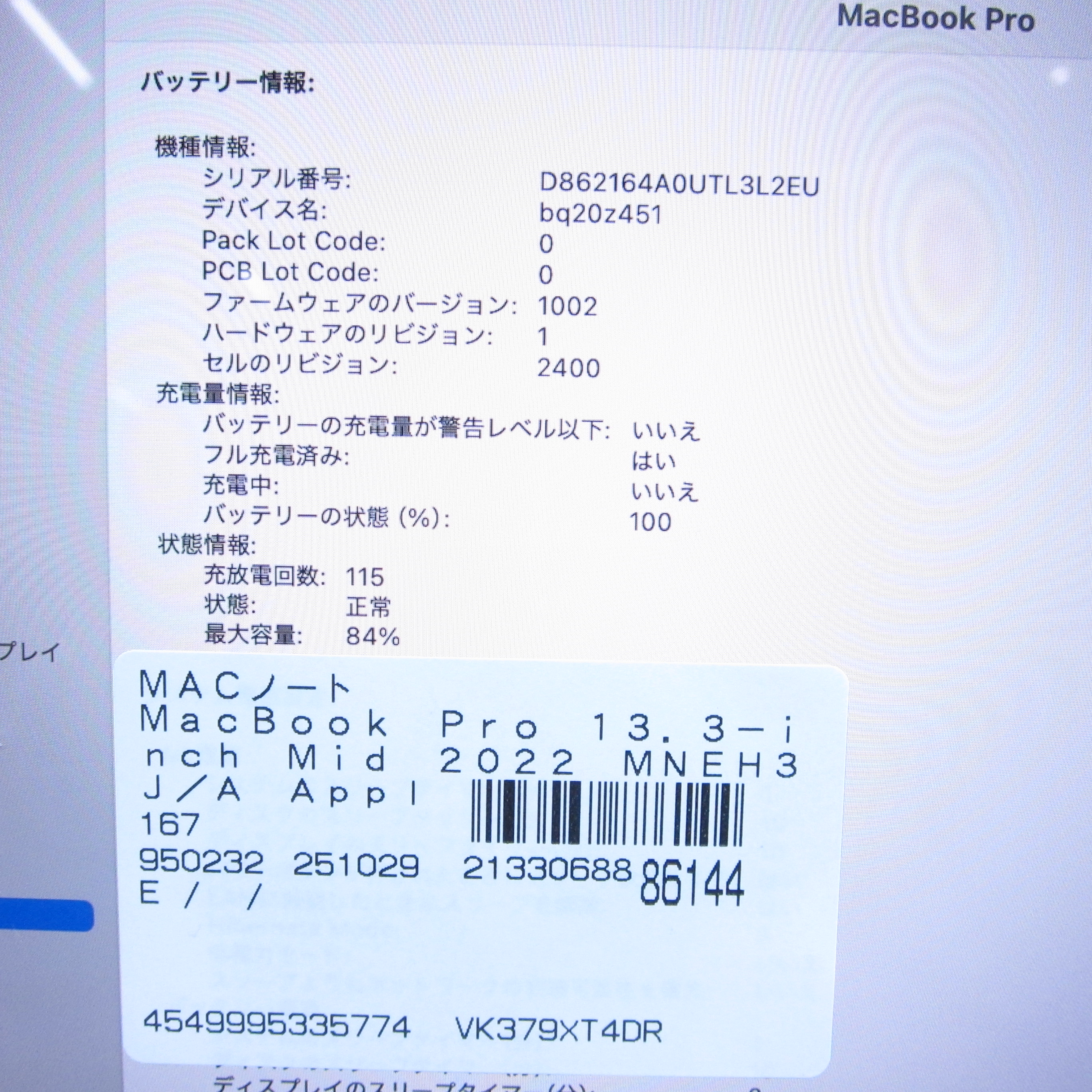商品名 〔中古品〕 MacBook Pro 13.3-inch Mid-2022 MNEH3J/A Apple M2 8コアCPU_10コアGPU 8GB SSD256GB スペースグレイ 〔15.3 Sequoia〕 [グラフィック:オンボード/JISキーボード]