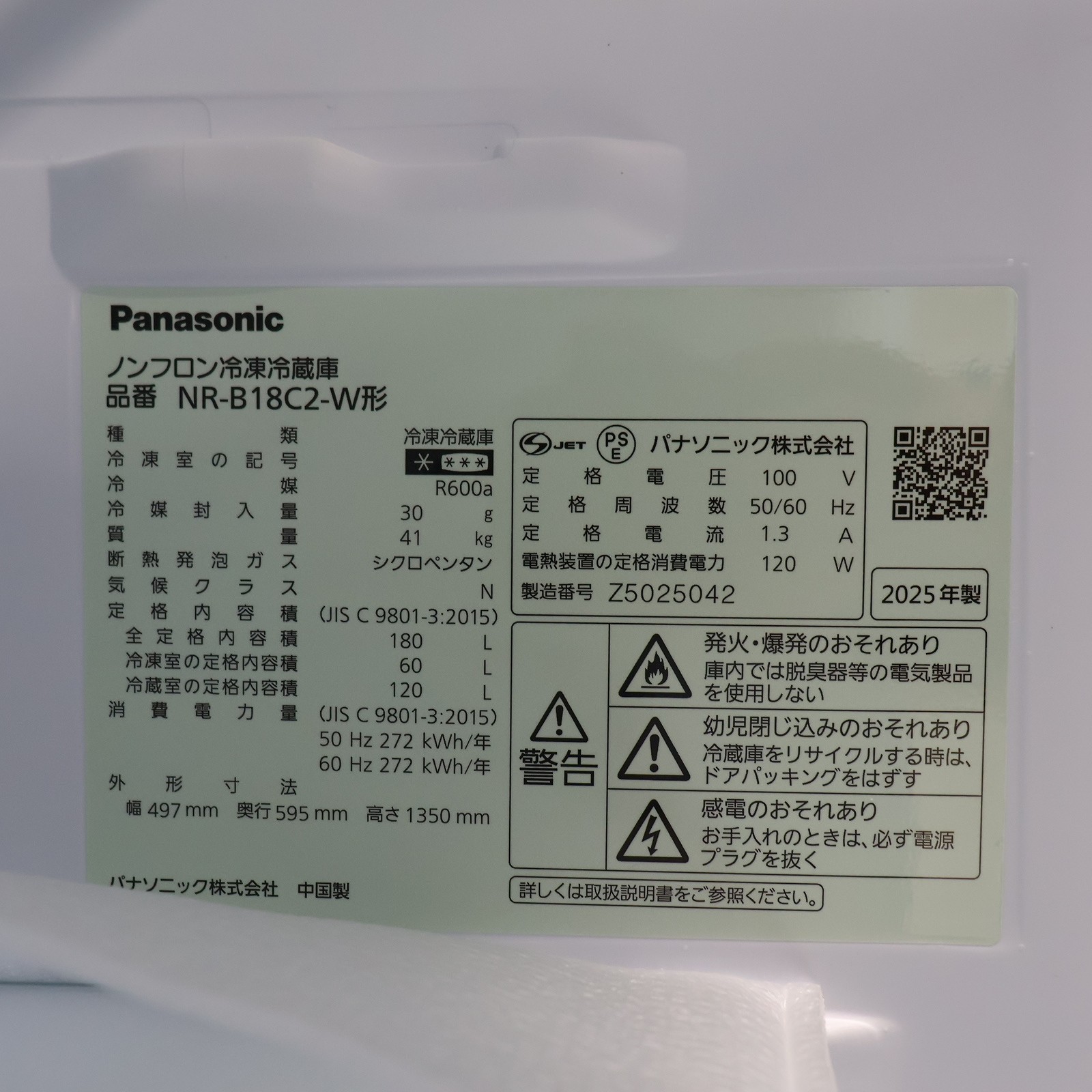 〔展示品〕 冷蔵庫 パーソナルタイプ マットオフホワイト NR-B18C2-W [幅49.7cm /180L /2ドア /右開きタイプ /2024年]