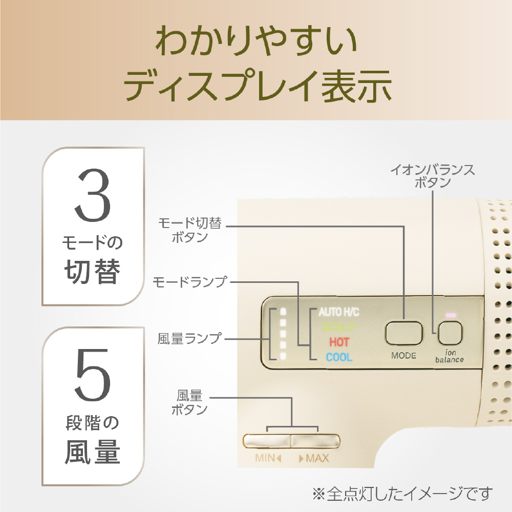 5段階の風量調節や、温冷自動切替、スカルプなどのモード状態をわかりやすく表示。