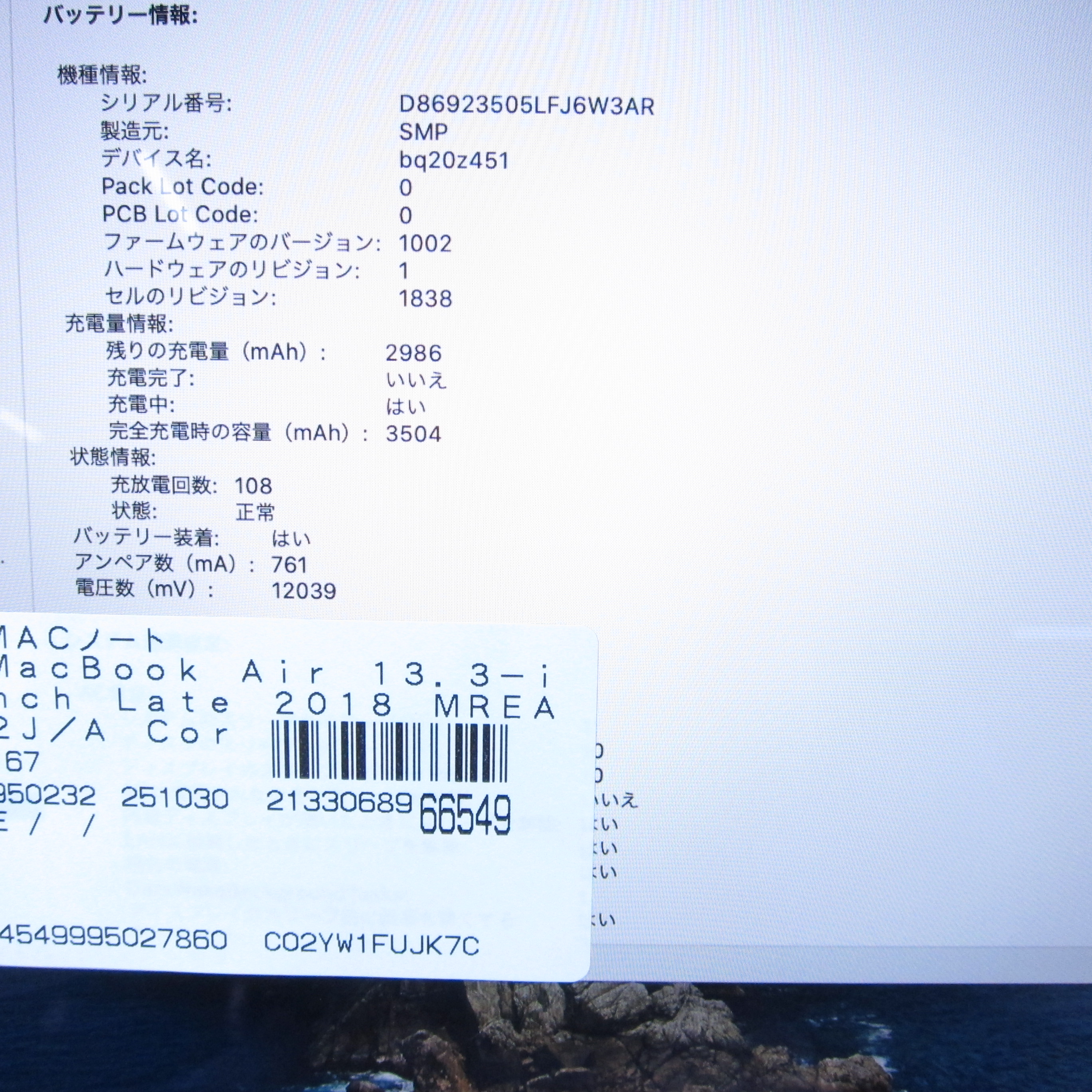 〔中古品〕 MacBook Air 13.3-inch Late-2018 MREA2J/A Core_i5 1.6GHz 8GB SSD128GB シルバー 〔10.15 Catalina〕 [グラフィック:Intel UHD Graphics 617/JISキーボード]