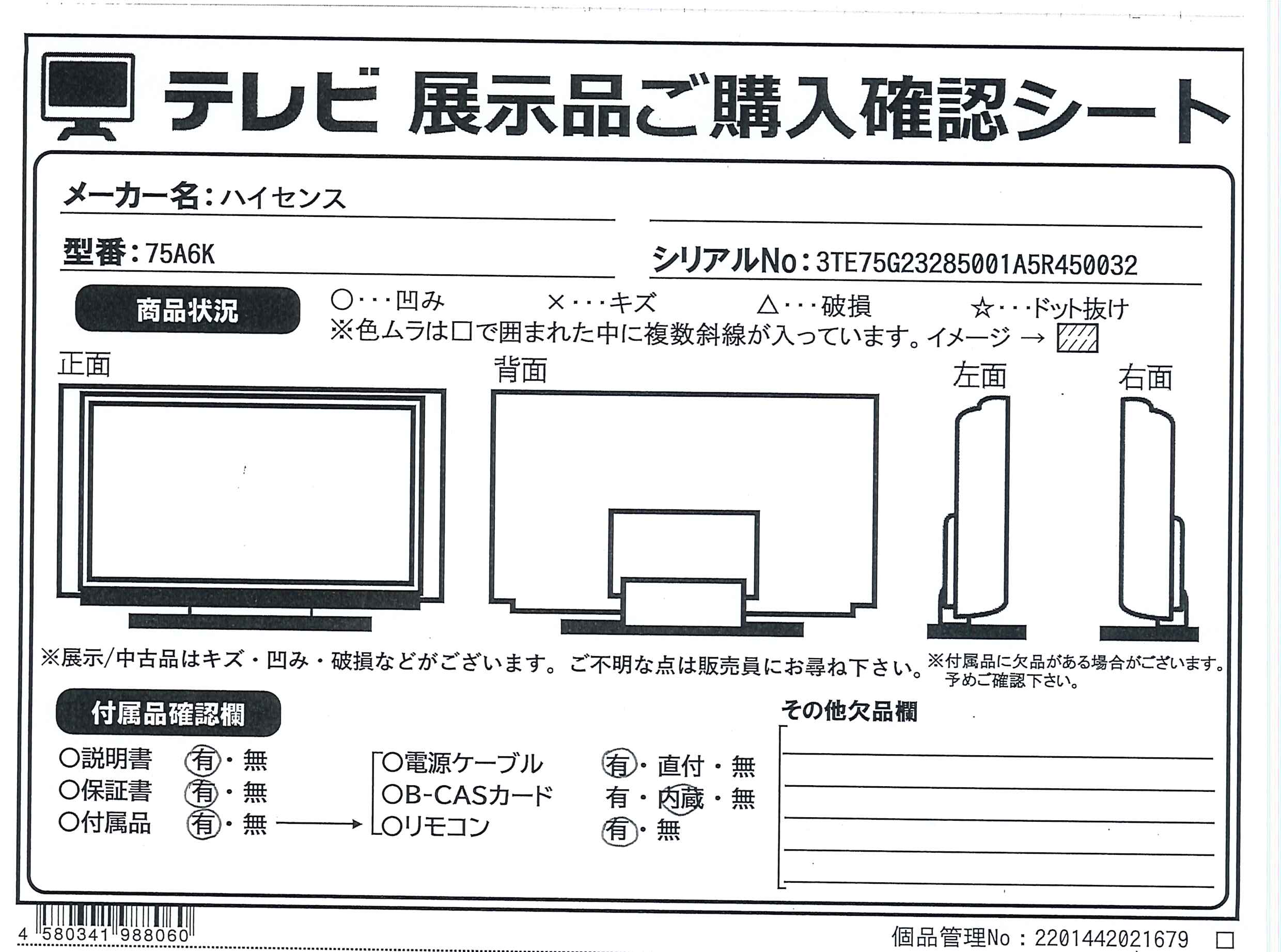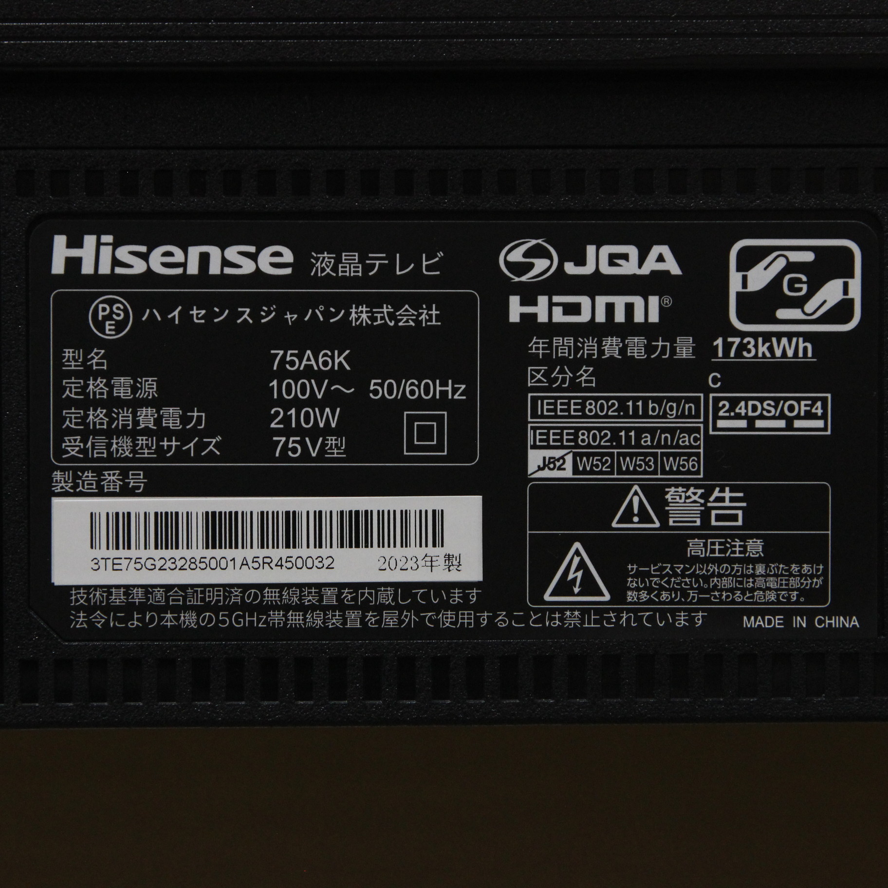 〔展示品〕 液晶テレビ 75A6K [75V型 /Bluetooth対応 /4K対応 /BS・CS 4Kチューナー内蔵 /YouTube対応]
