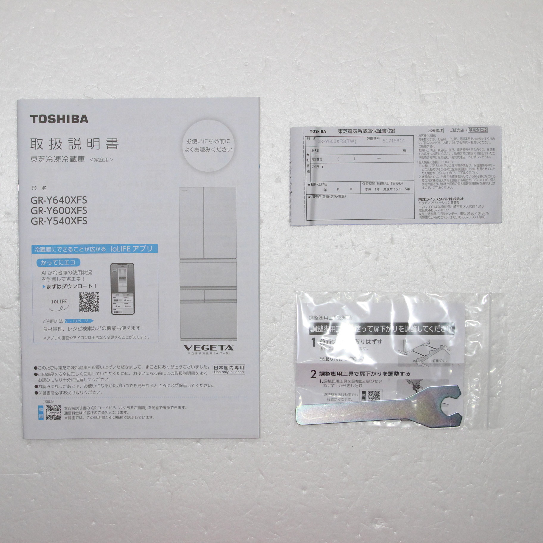 〔付属品〕説明書、調整脚×2、脚カバー、調整脚用工具、給水タンク、フリーケース、卵スタンド、アルミトレイ(チルド)、使い切り野菜BOX、おそうじ口のフタ、アルミトレイ、アイスシャベル