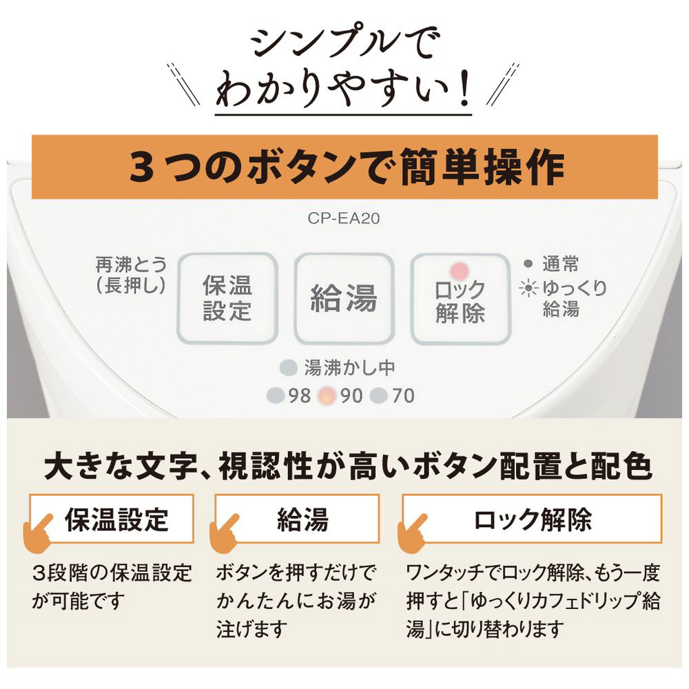 〔展示品〕 電動ポット ホワイト CP-EA20-WA [2.0L /蒸気レス]