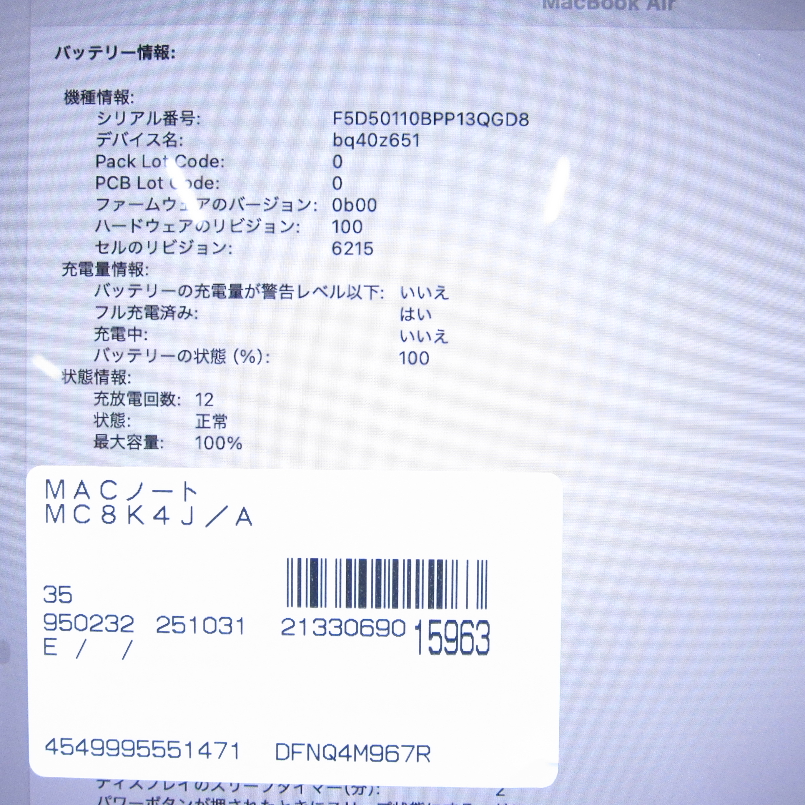 〔中古品〕 MacBook Air 13.6-inch Late-2024 MC8K4J/A Apple M3 8コアCPU_8コアGPU 16GB SSD256GB ミッドナイト 〔15.7 Sequoia〕 [グラフィック:オンボード/JISキーボード]