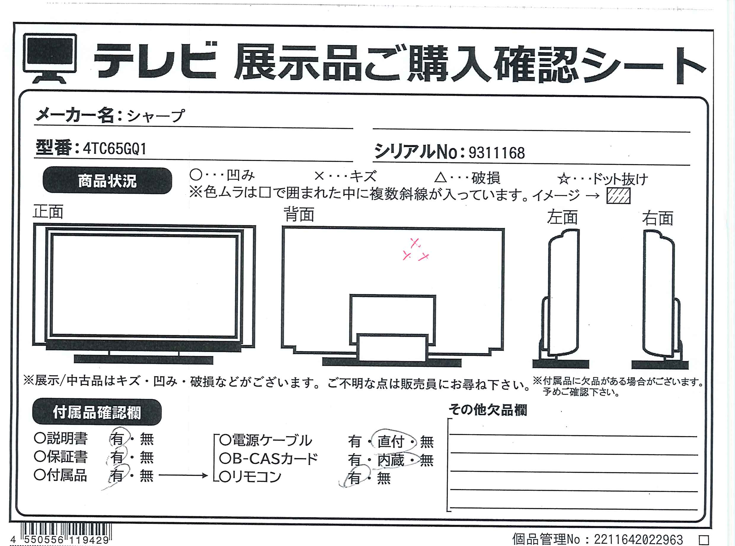中古商品ランクについて 付属品・商品状態について 〔付属品〕説明書、かんたん使い方ガイド、リモコン、リモコン用単4形乾電池×2、スタンド一式、スタンドカバー、転倒防止ベルト一式、スタンド回転ロックネジ