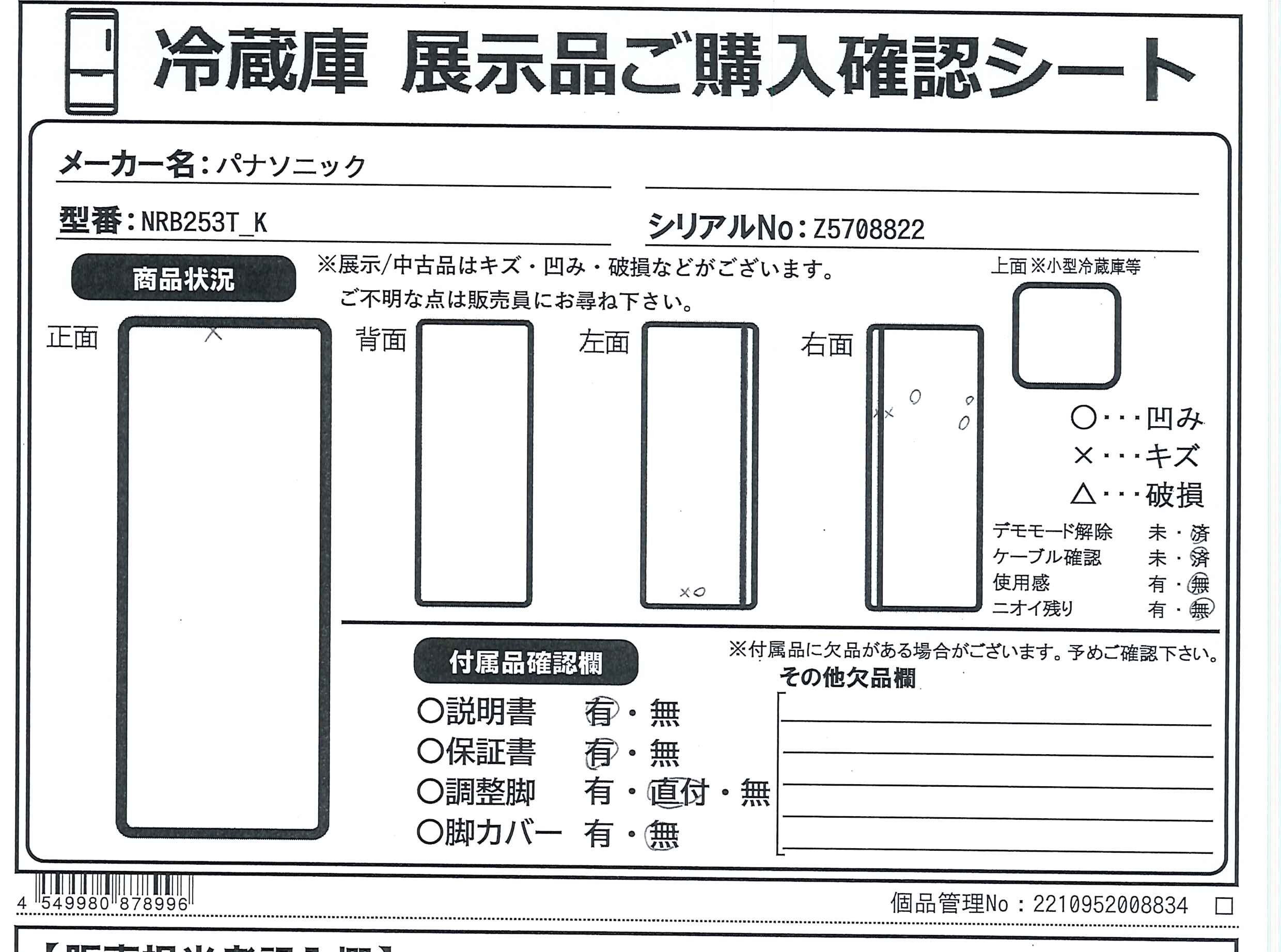 中古商品ランクについて 付属品・商品状態について 〔付属品〕説明書、調節脚、製氷皿、仕切りケース(貯氷箱)、卵トレイX2、蒸発皿
