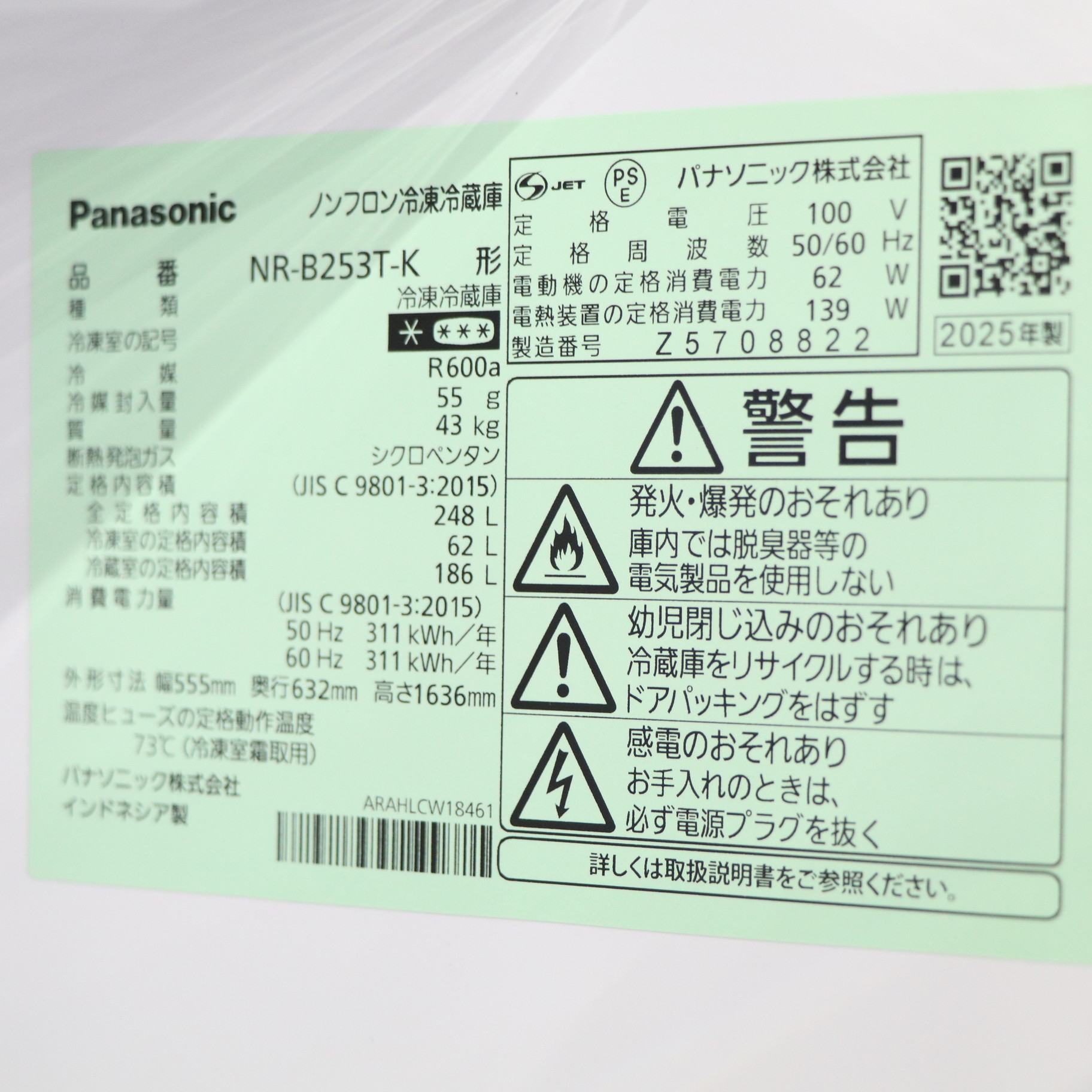 〔展示品〕 冷蔵庫 トップフリーザータイプ マットブラック NR-B253T-K [幅55.5cm /248L /2ドア /右開きタイプ /2025年]