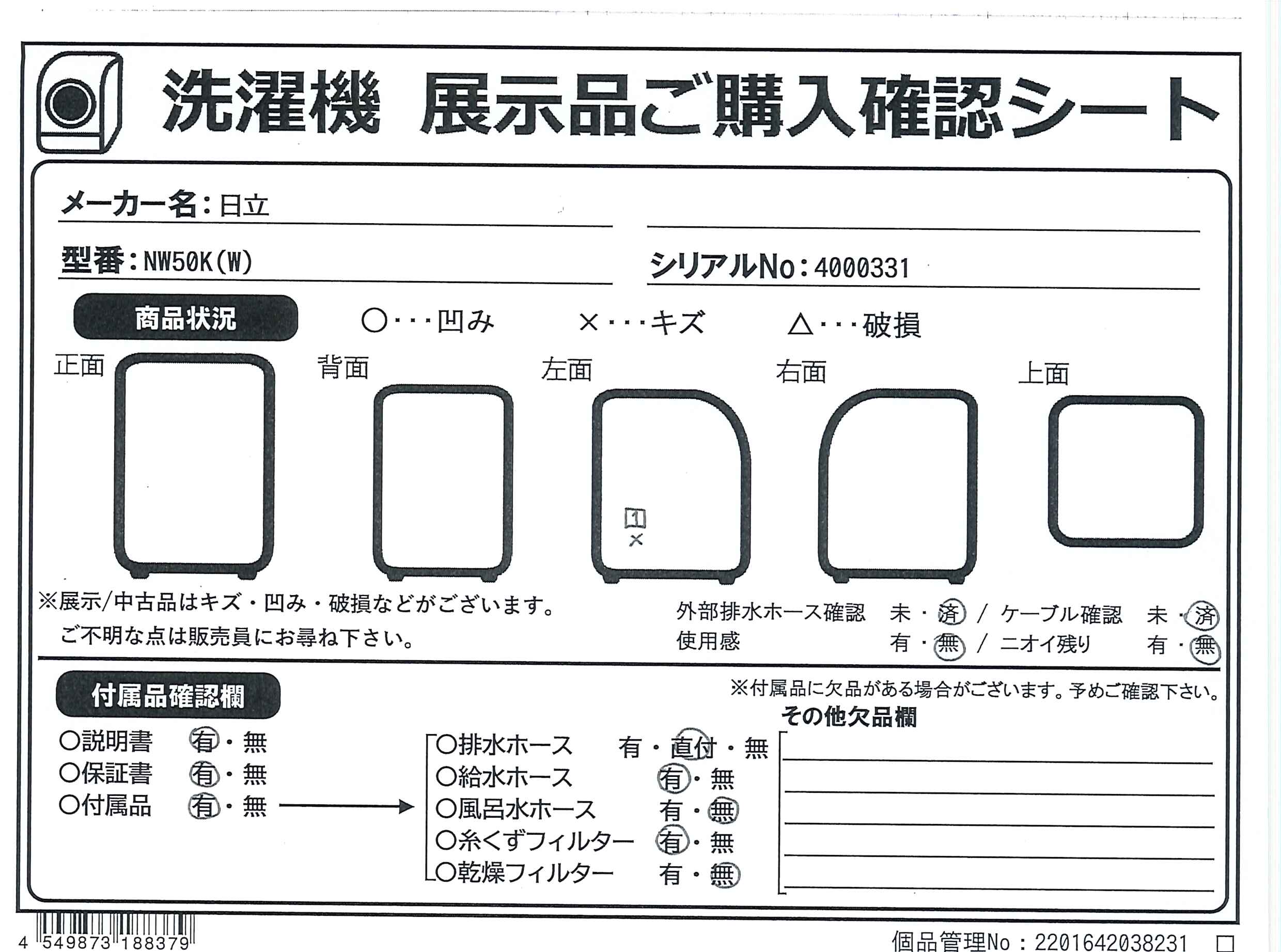 中古商品ランクについて 付属品・商品状態について 〔付属品〕取付説明書、給水ホース、水準器、保護カバー、据付説明書