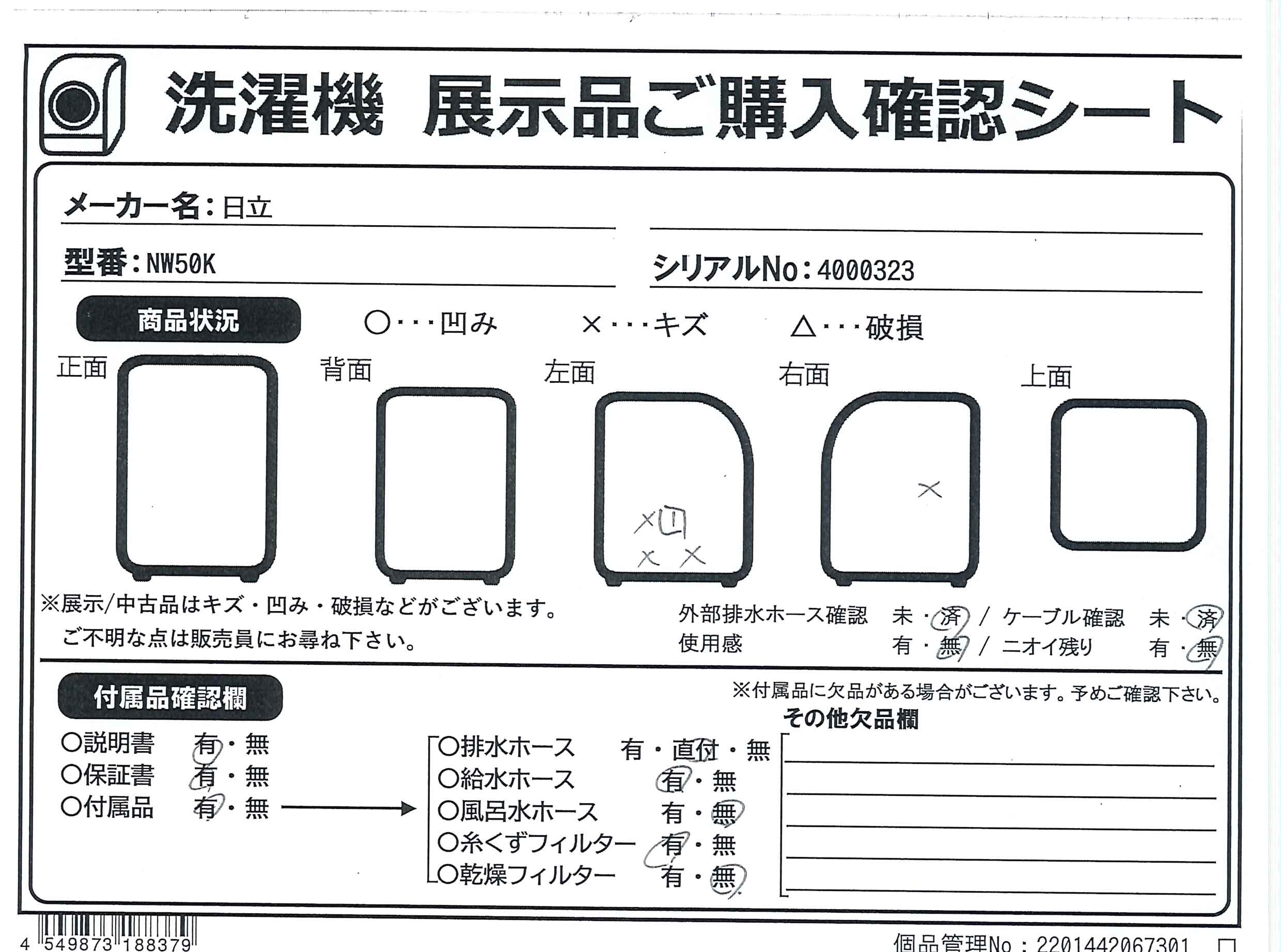中古商品ランクについて 付属品・商品状態について 〔付属品〕取付説明書、給水ホース、水準器、保護カバー、据付説明書