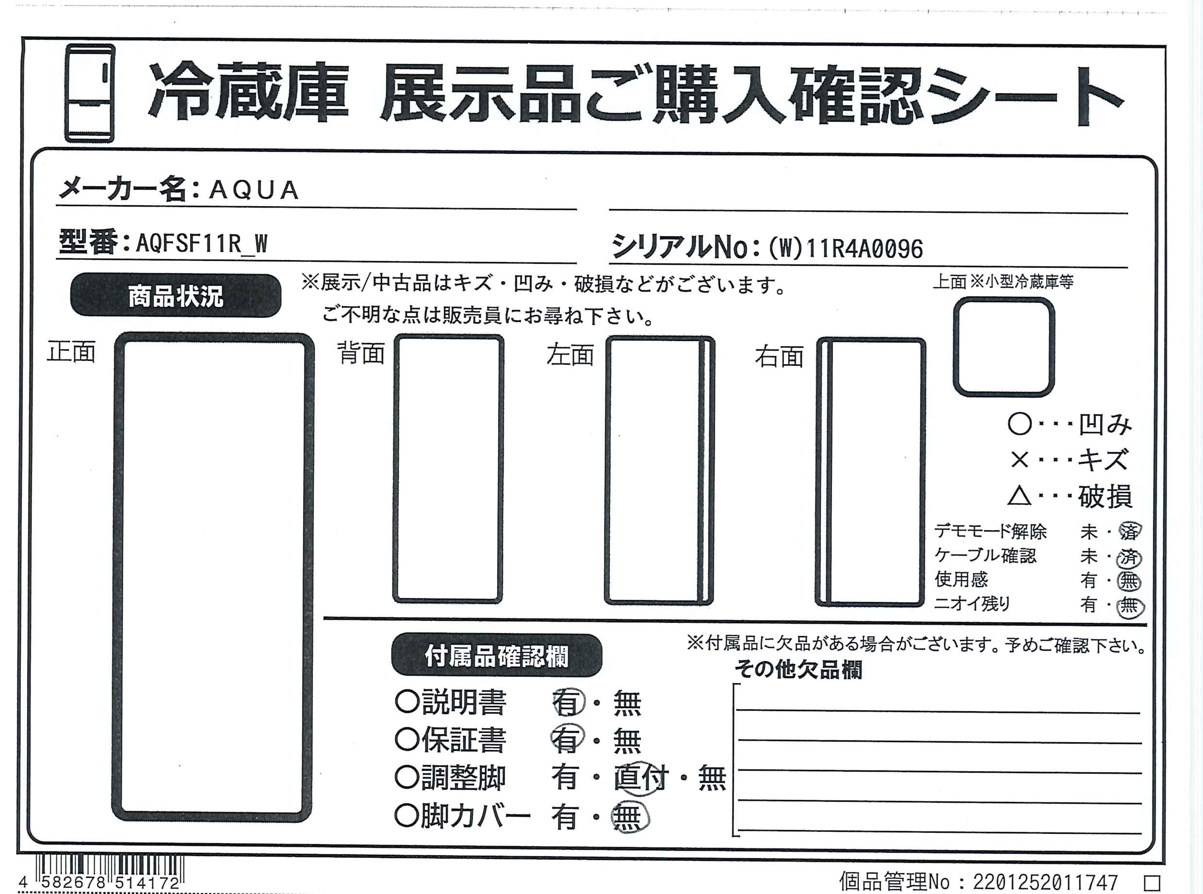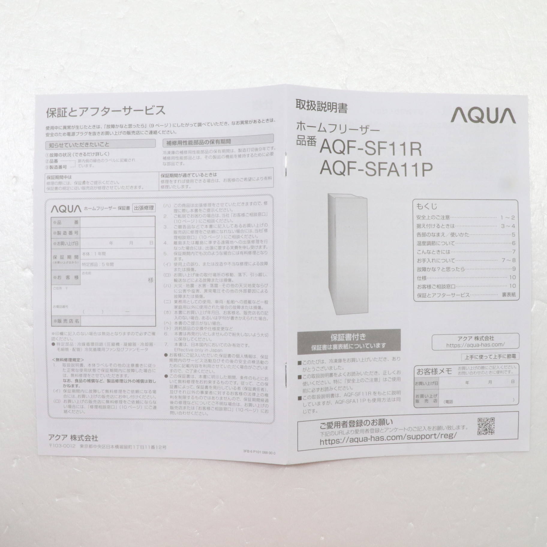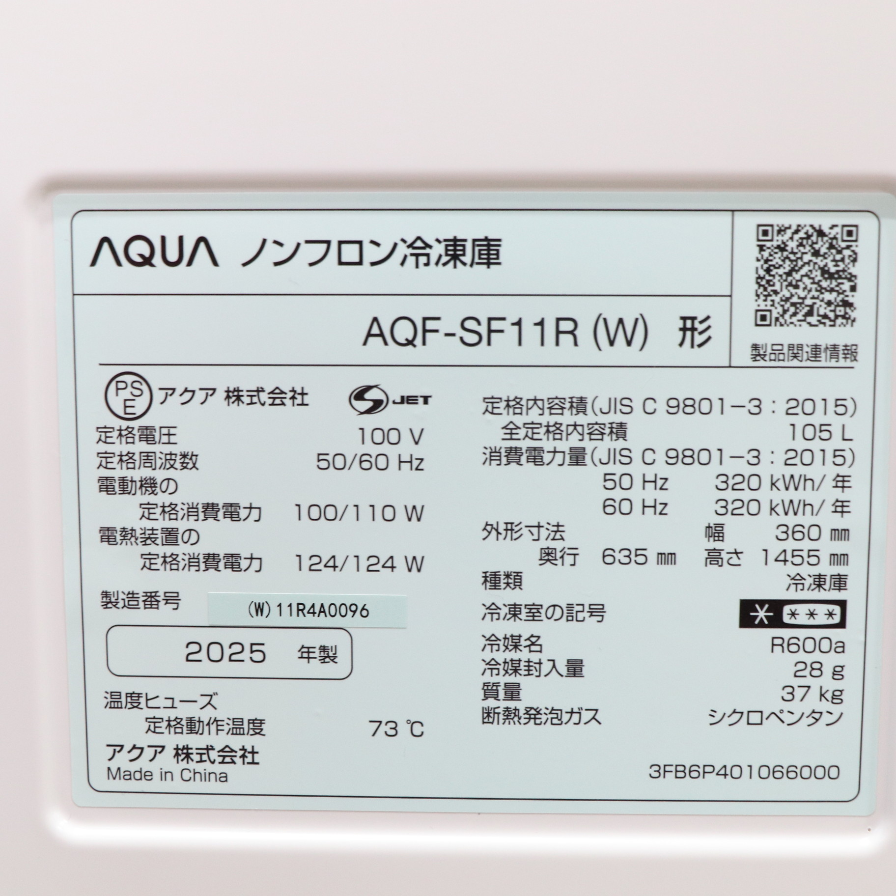 〔展示品〕 ファン式冷凍庫 ホワイト AQF-SF11R-W [幅36cm /105L /1ドア /右開きタイプ /2025年]
