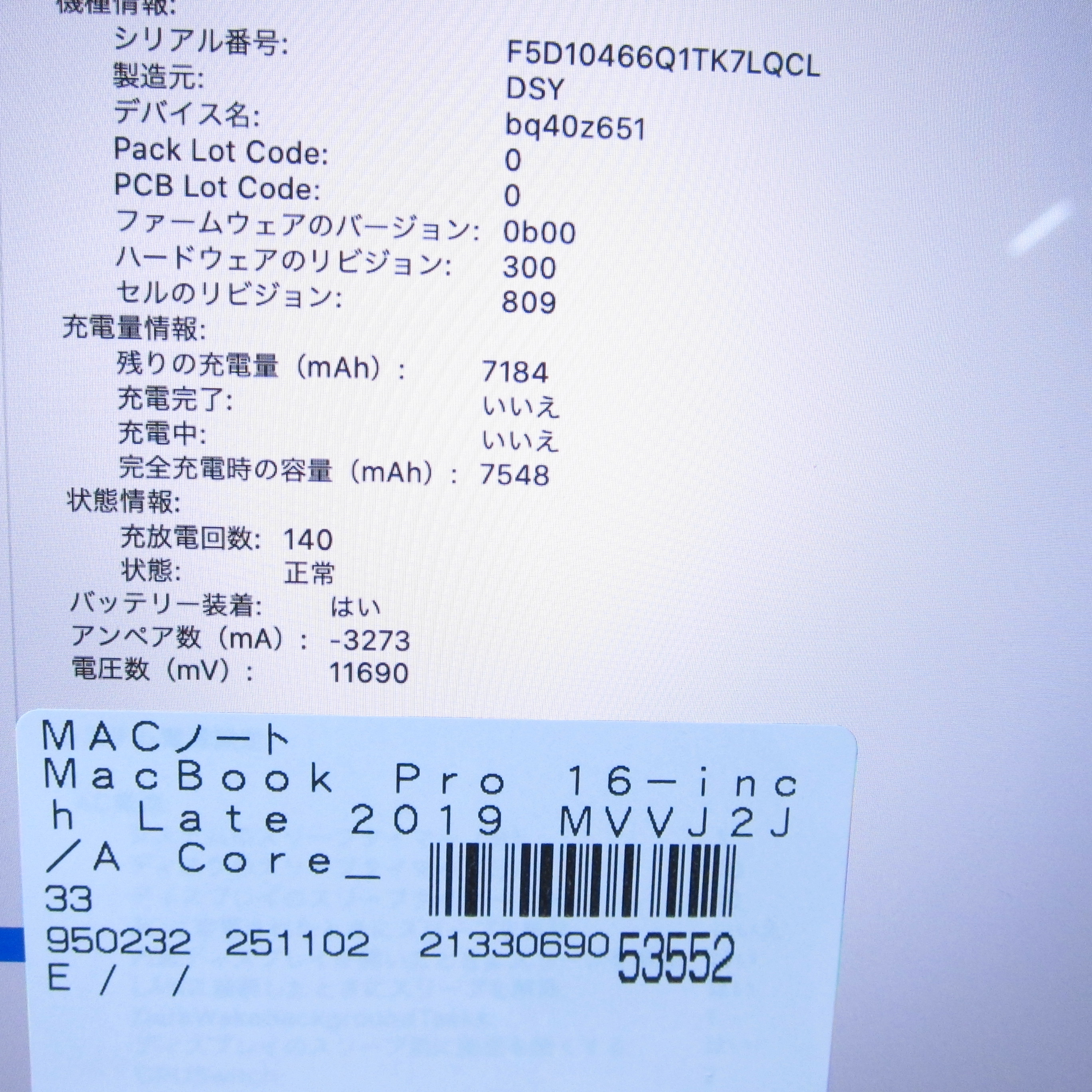 商品名 〔中古品〕 MacBook Pro 16-inch Late-2019 MVVJ2J/A Core_i7 2.6GHz 16GB SSD512GB スペースグレイ 〔10.15 Catalina〕 [グラフィック:Radeon Pro 5300M(4GB)/JISキーボード]