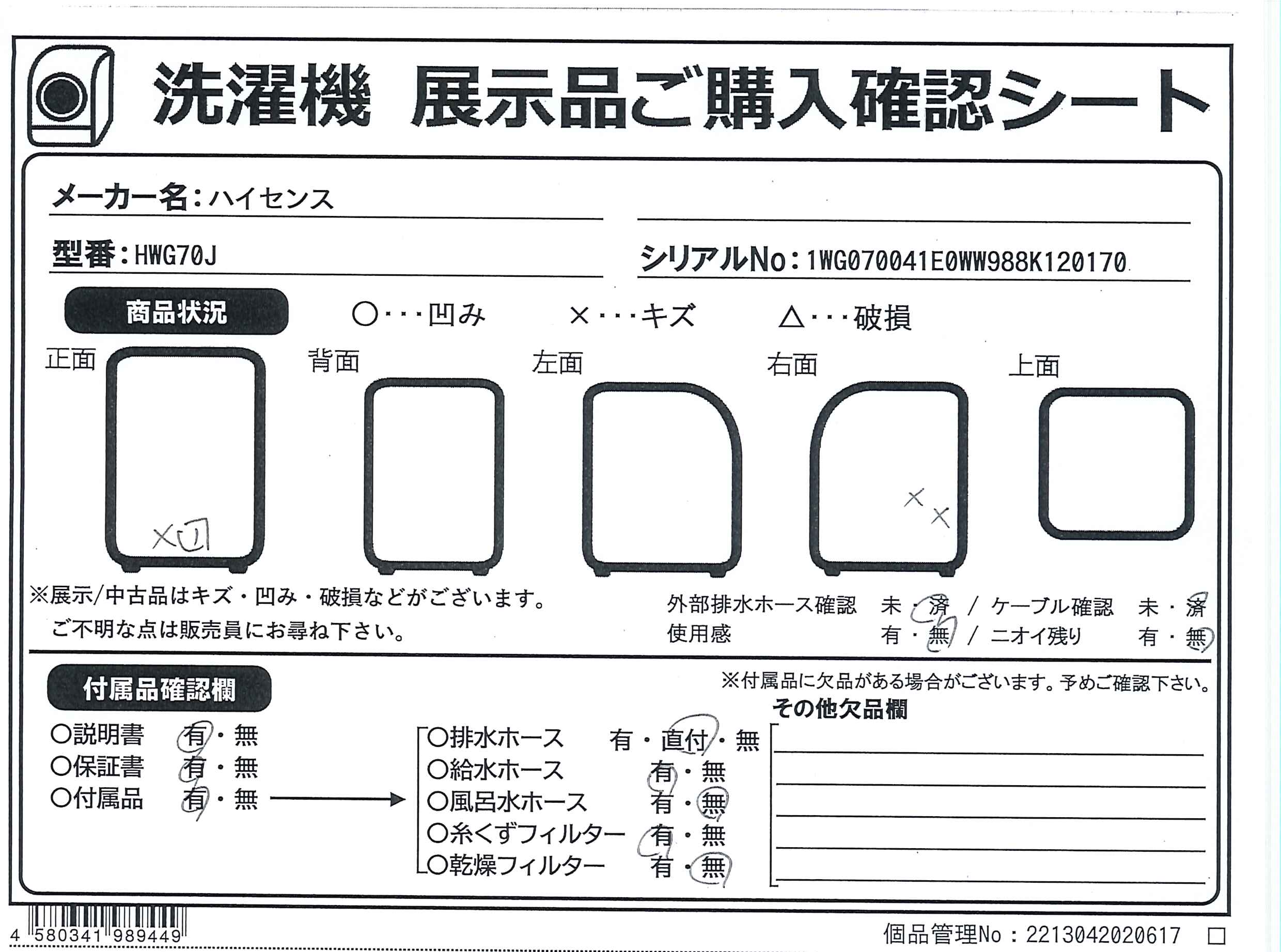 中古商品ランクについて 付属品・商品状態について 〔付属品〕説明書、給水ホース、給水つぎ手、排水スリーブ、底カバー(ネジ1本つき)