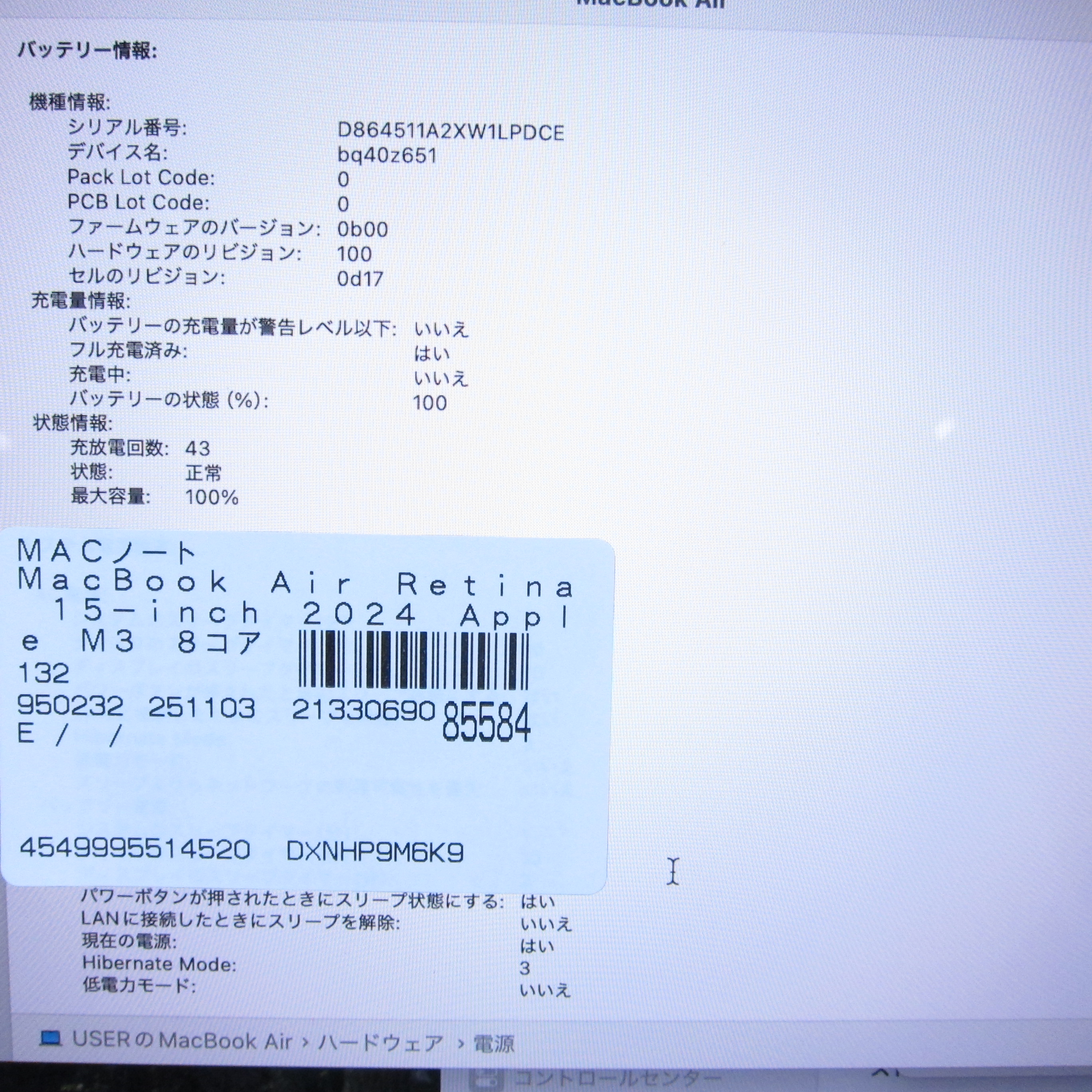 〔中古品〕 MacBook Air 15.3-inch Early-2024 MXD13J/A Apple M3 8コアCPU_10コアGPU 16GB SSD512GB スペースグレイ 〔15.3 Sequoia〕 [グラフィック:オンボード/JISキーボード]