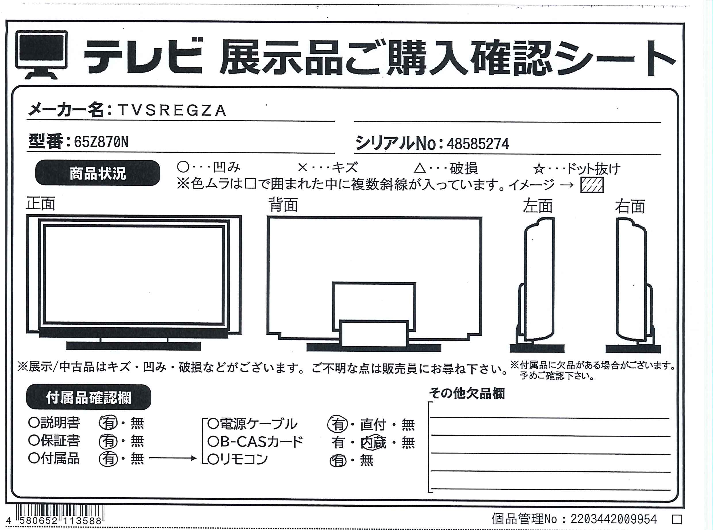 中古商品ランクについて 付属品・商品状態について 〔付属品〕取扱説明書、スタンド、スタンドネジ×8、リモコン、電源コード、ネジ(長)、ネジ(短)、転倒防止バンド、コードクランプ、スタンドカバー、単四形乾電池×2