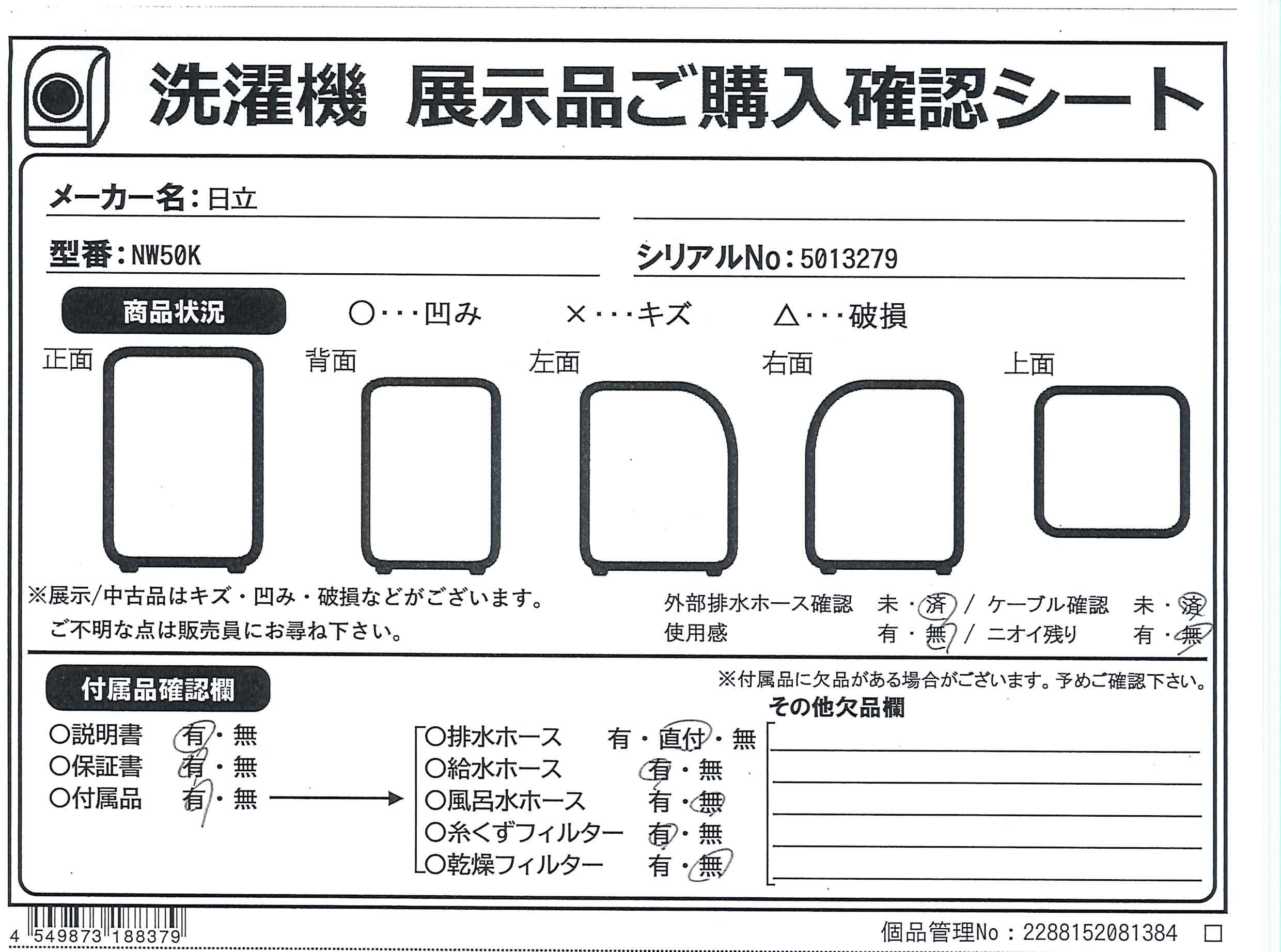 中古商品ランクについて 付属品・商品状態について 〔付属品〕取付説明書、給水ホース、水準器、保護カバー、据付説明書