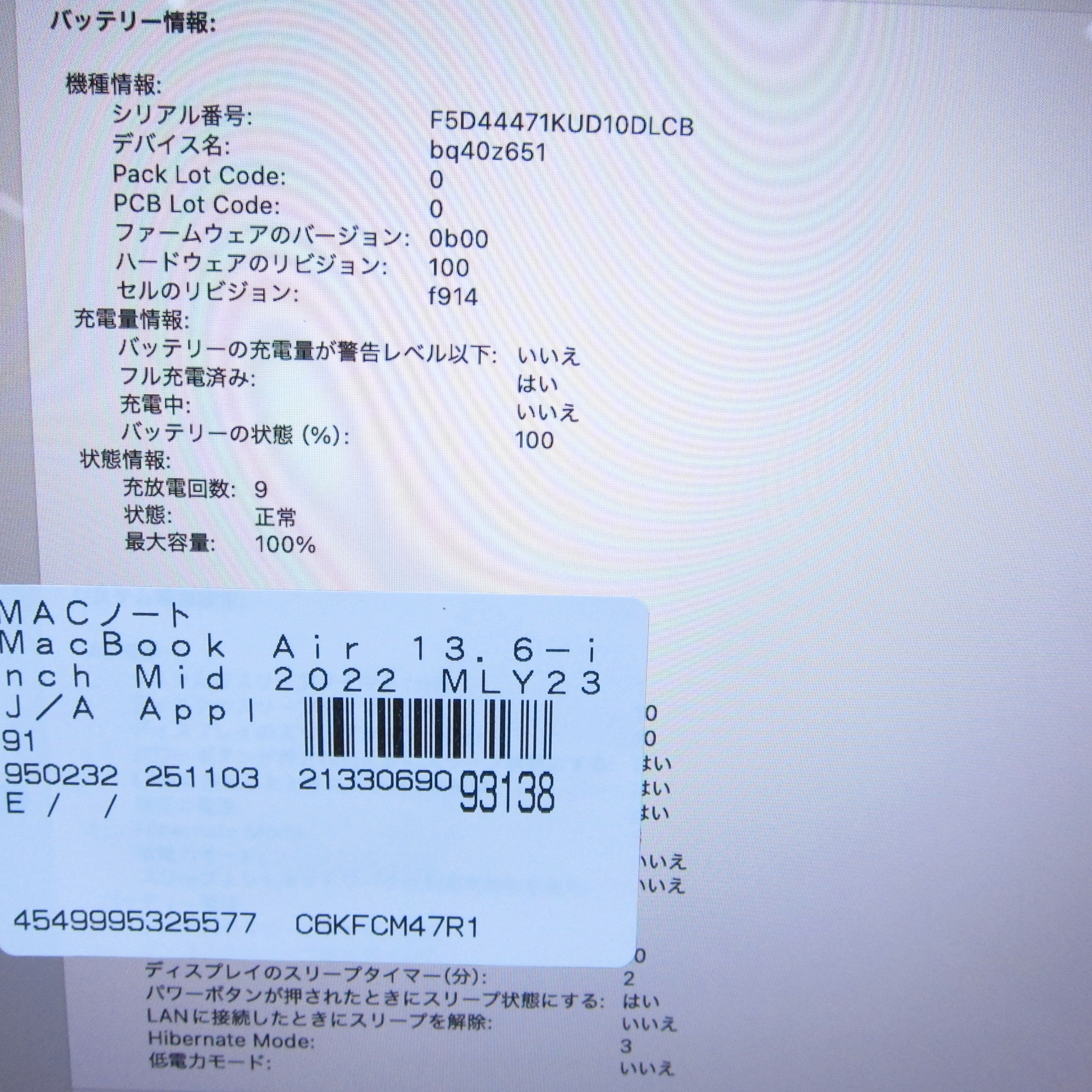 〔中古品〕 MacBook Air 13.6-inch Mid-2022 MLY23J/A Apple M2 8コアCPU_10コアGPU 16GB SSD1TB スターライト 〔15.3 Sequoia〕 [グラフィック:オンボード/USキーボード]