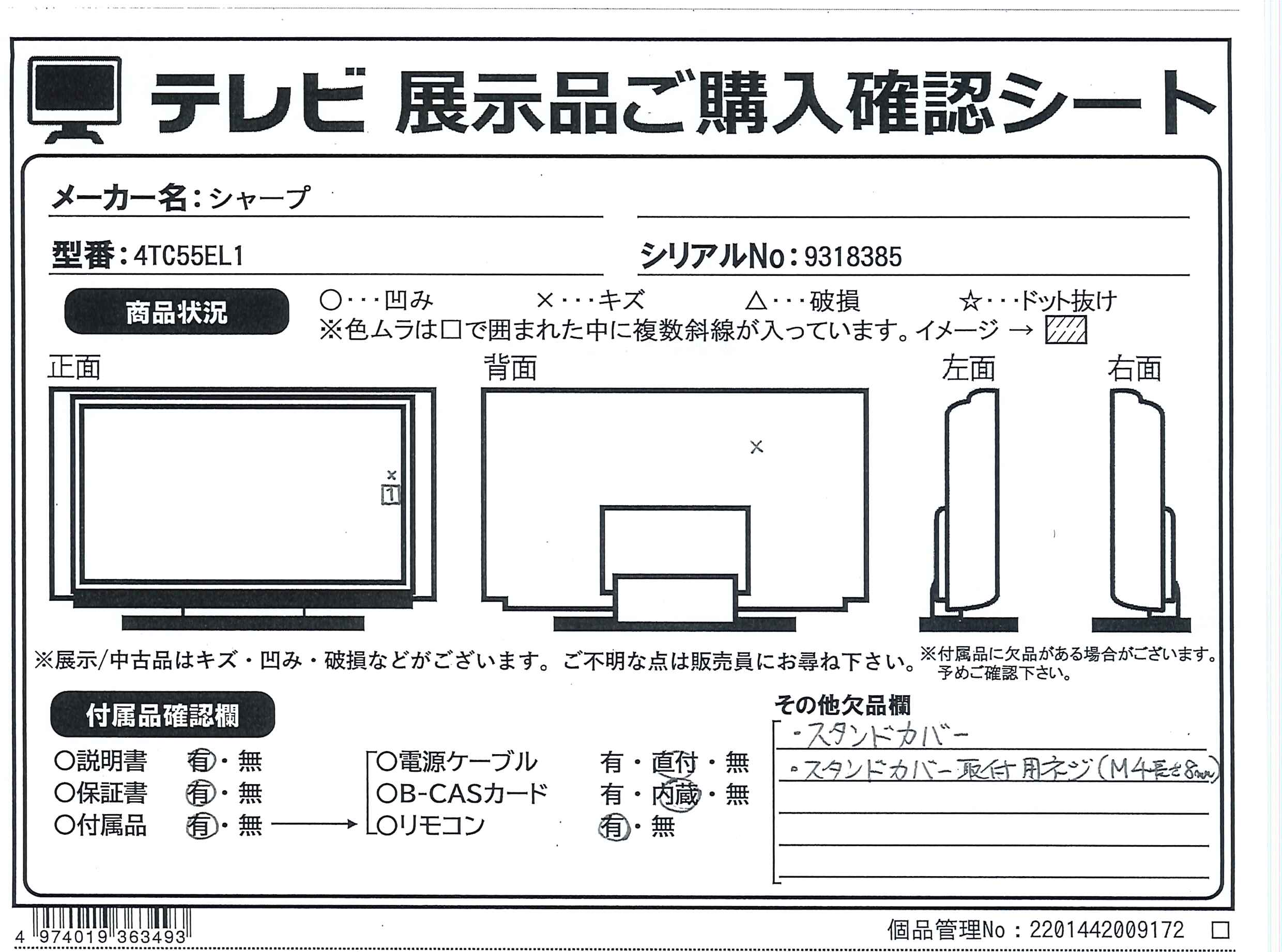 商品名 〔展示品〕 液晶テレビ AQUOS(アクオス) 4T-C55EL1 [55V型 /Bluetooth対応 /4K対応 /BS・CS 4Kチューナー内蔵 /YouTube対応]