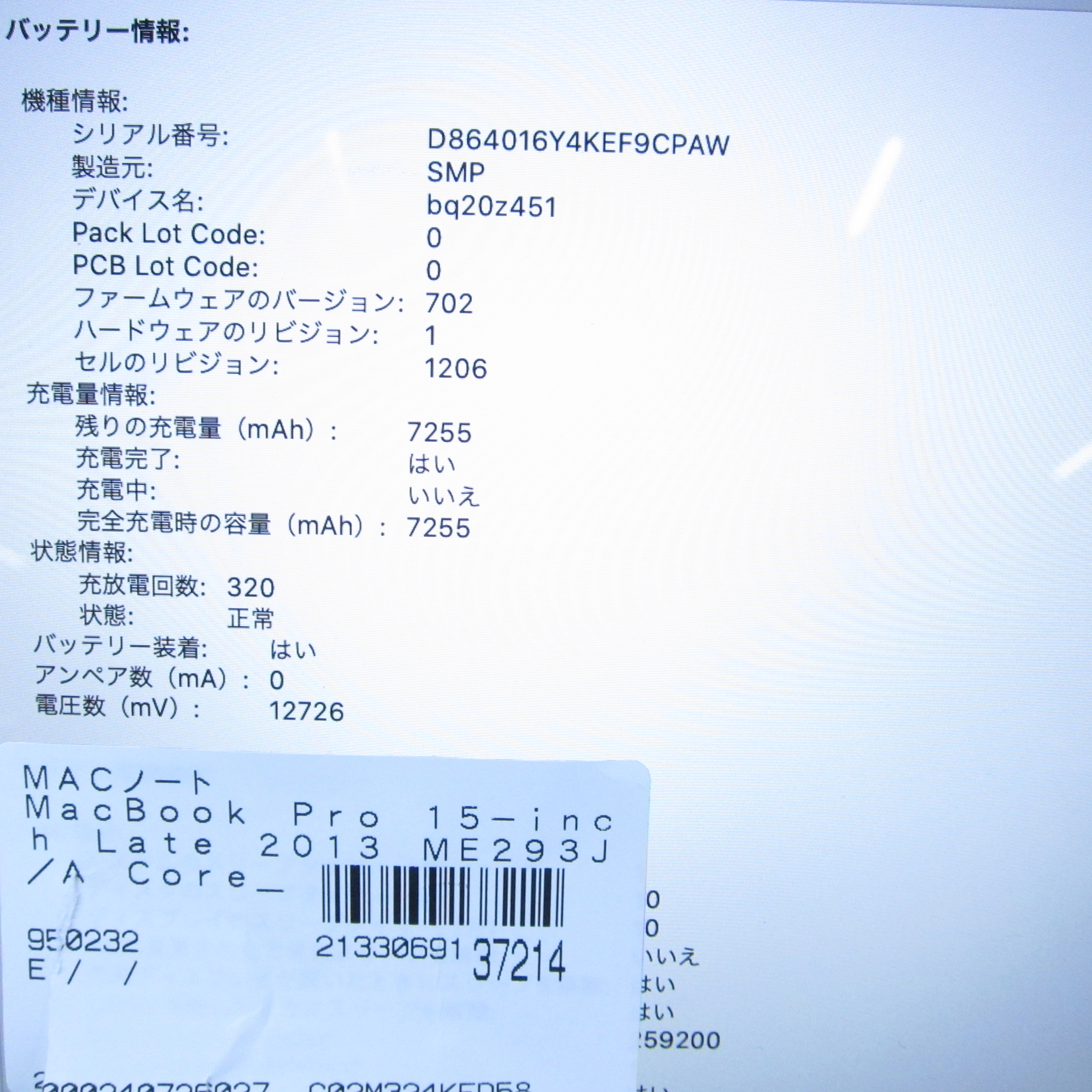 〔中古品〕 MacBook Pro 15-inch Late-2013 ME293J/A Core_i7 2.3GHz 8GB SSD256GB 〔10.15 Catalina〕 [グラフィック:Intel Iris Pro Graphics 5200/JISキーボード]