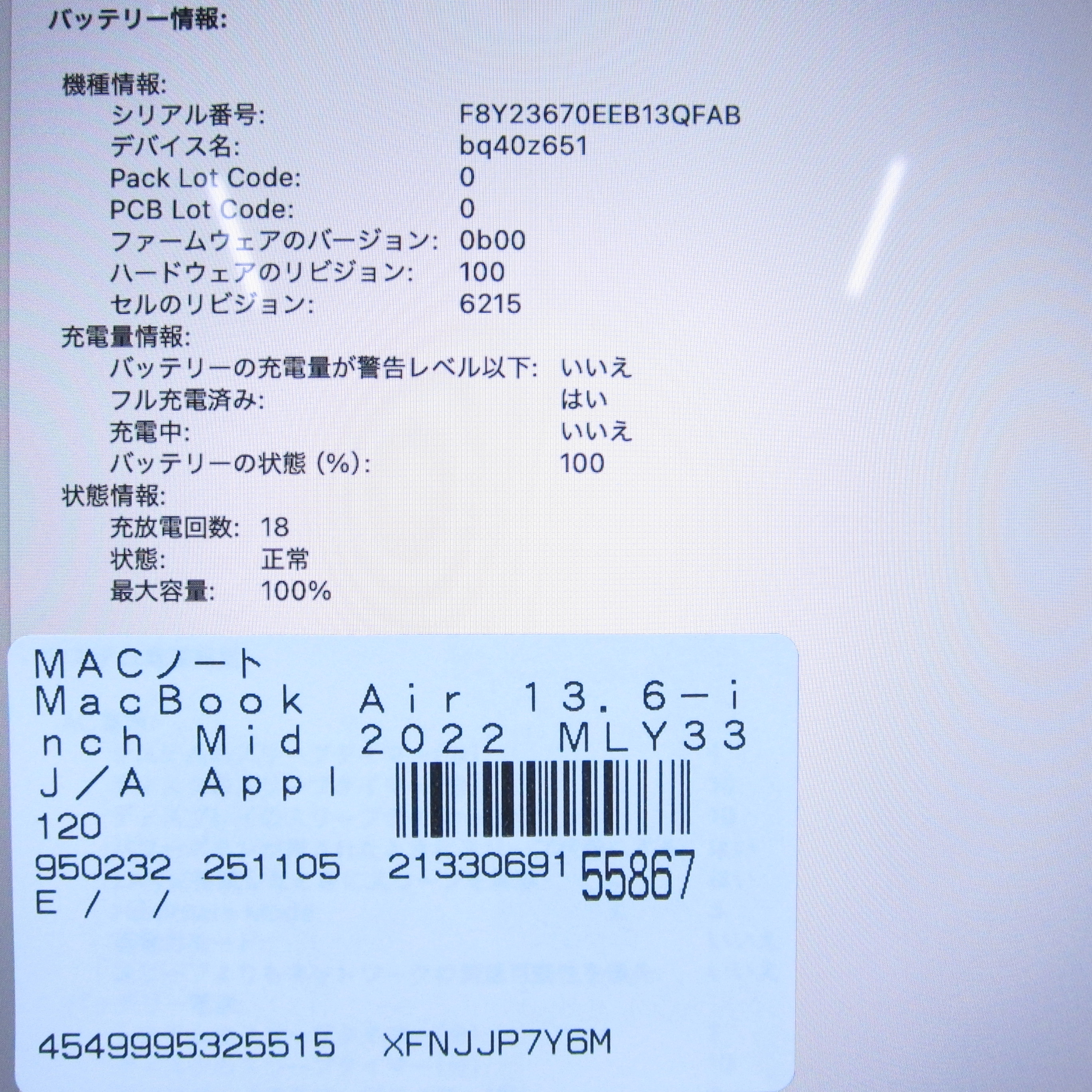 〔中古品〕 MacBook Air 13.6-inch Mid-2022 MLY33J/A Apple M2 8コアCPU_8コアGPU 8GB SSD256GB ミッドナイト 〔15.7 Sequoia〕 [グラフィック:オンボード/JISキーボード]