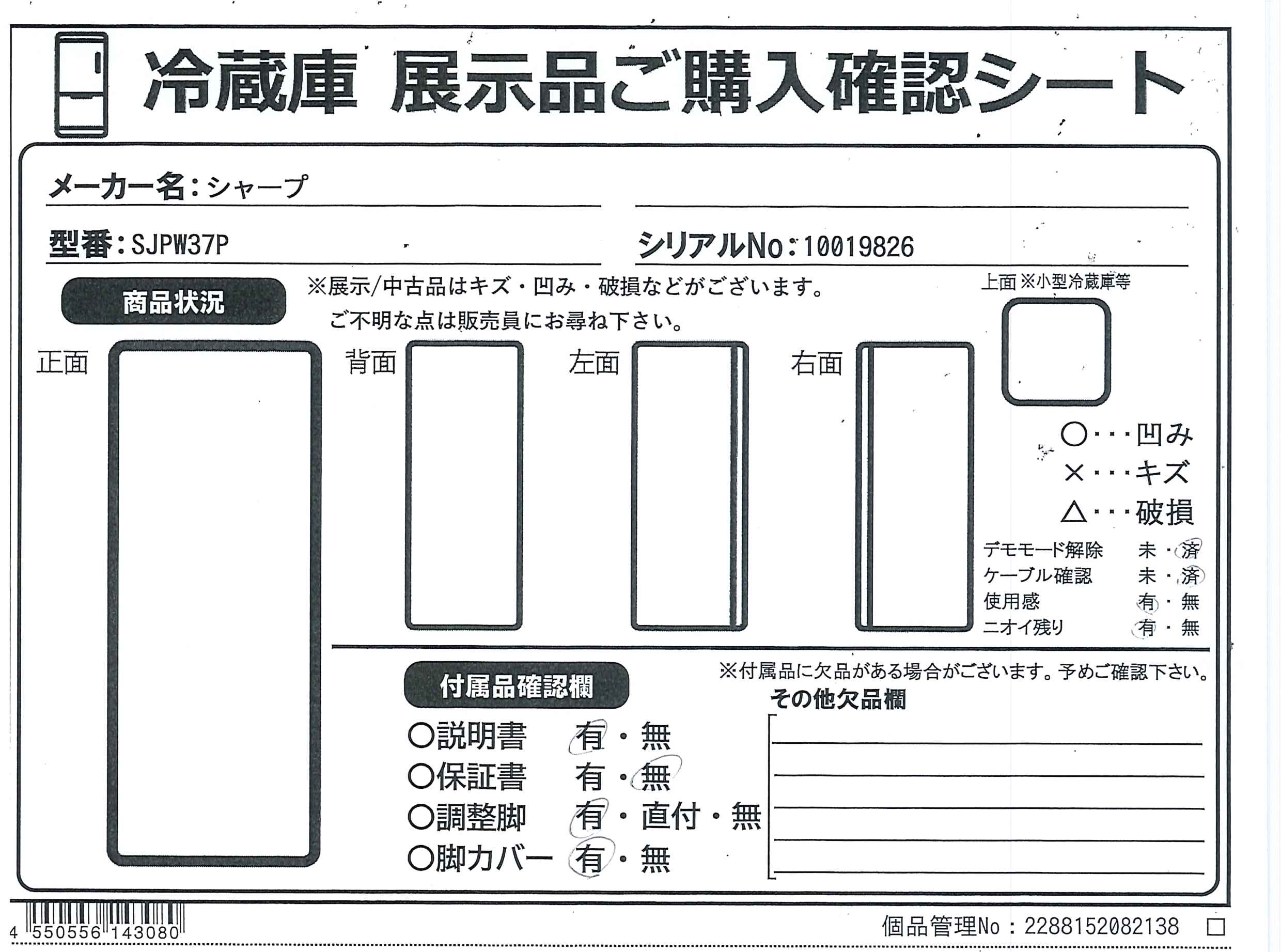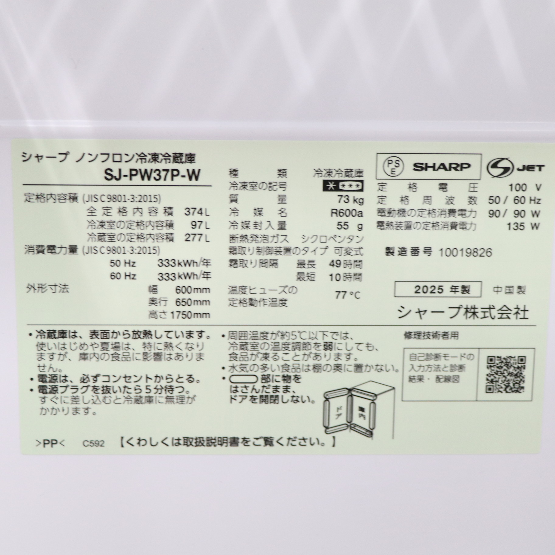 〔中古品〕 冷蔵庫 シルキーマットホワイト SJ-PW37P-W [幅60cm /374L /3ドア /左右開きタイプ /2024年]