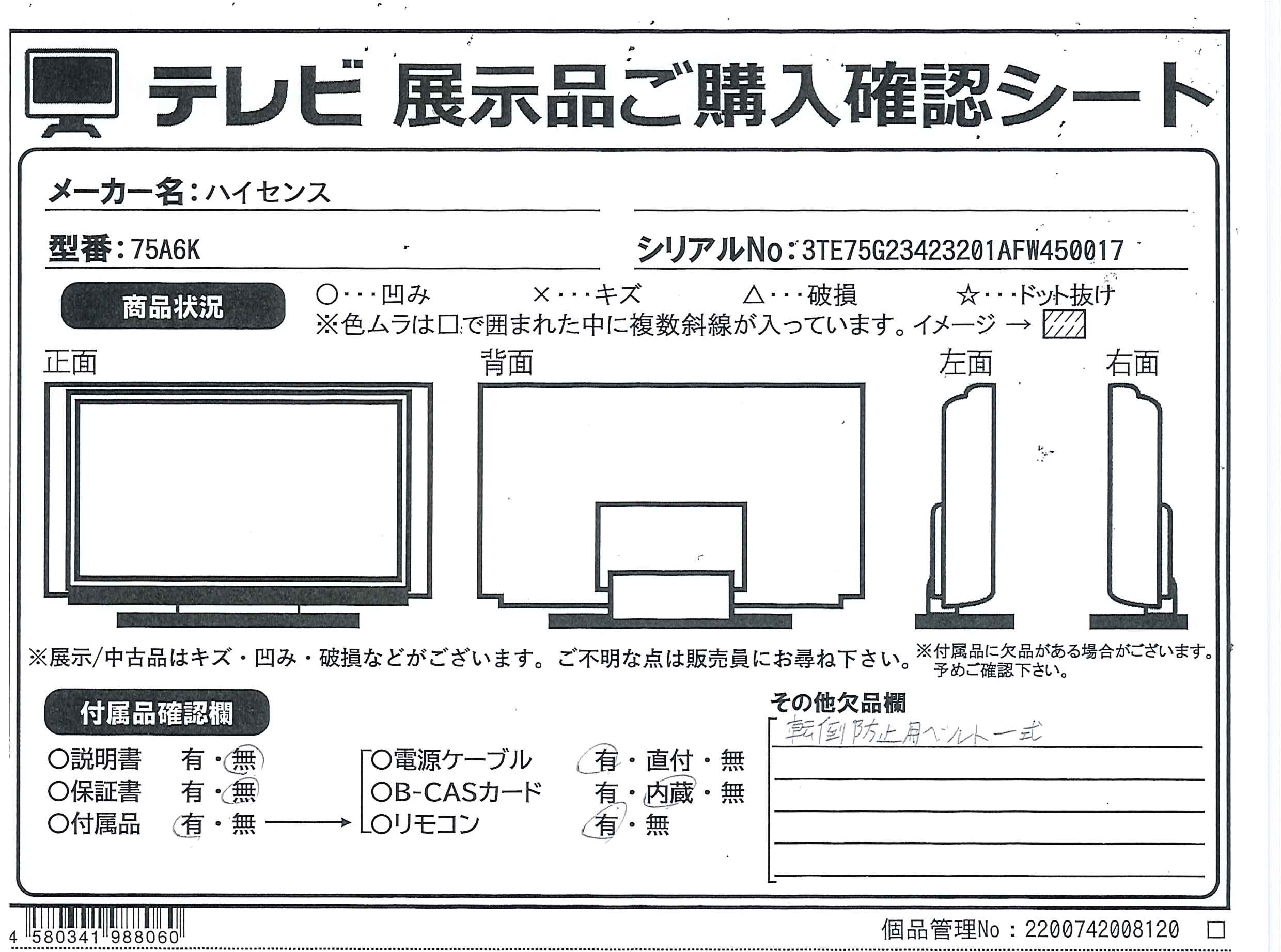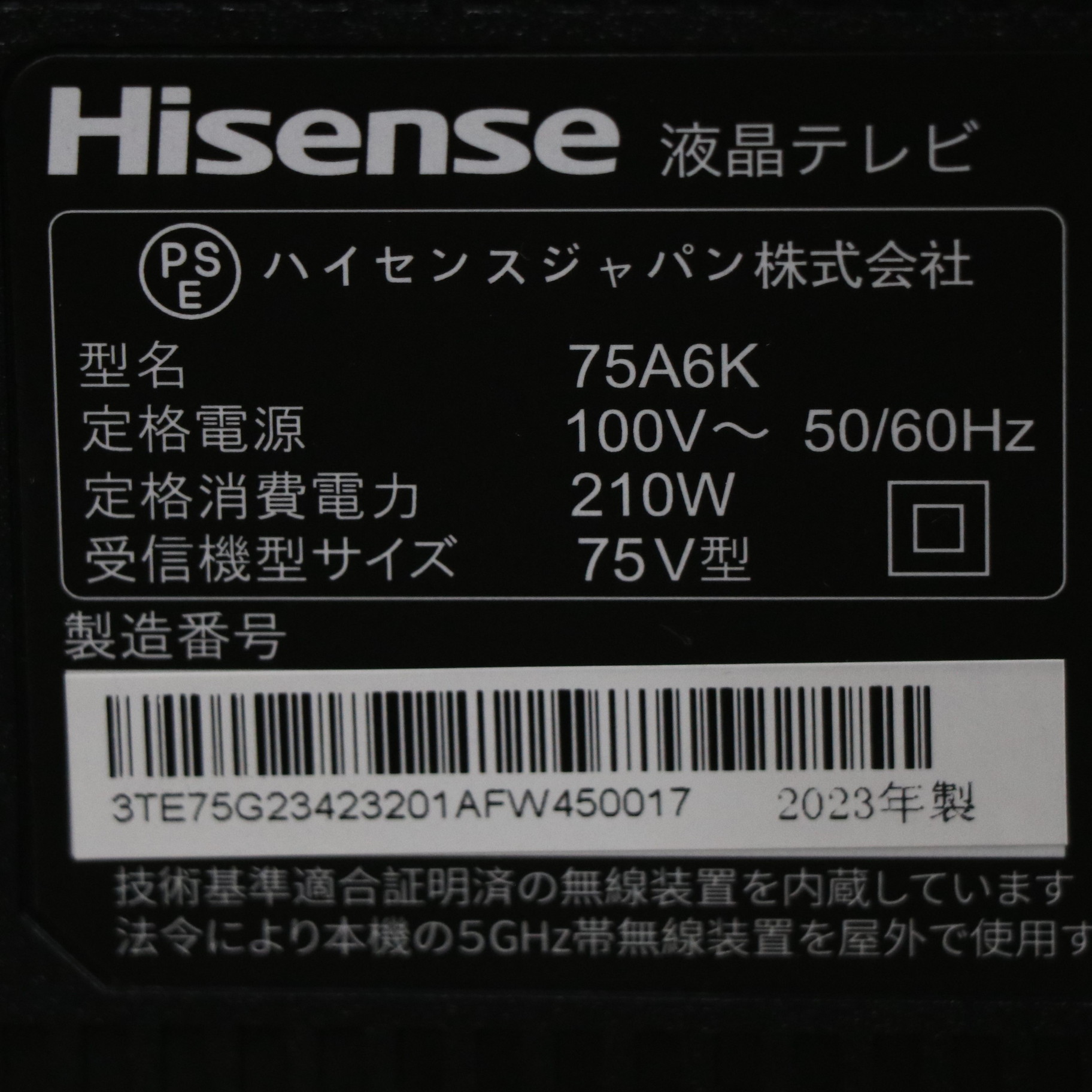 〔展示品〕 液晶テレビ 75A6K [75V型 /Bluetooth対応 /4K対応 /BS・CS 4Kチューナー内蔵 /YouTube対応]