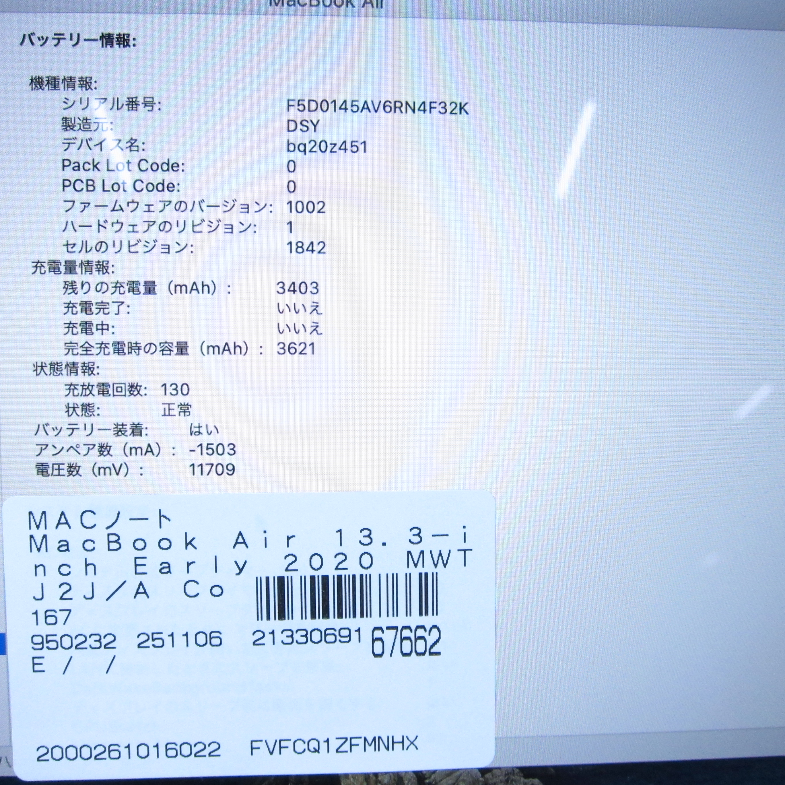 〔中古品〕 MacBook Air 13.3-inch Early-2020 MWTJ2J/A Core_i5 1.1GHz 8GB SSD256GB スペースグレイ 〔10.15 Catalina〕 [グラフィック:Intel Iris Plus Graphics/JISキーボード]