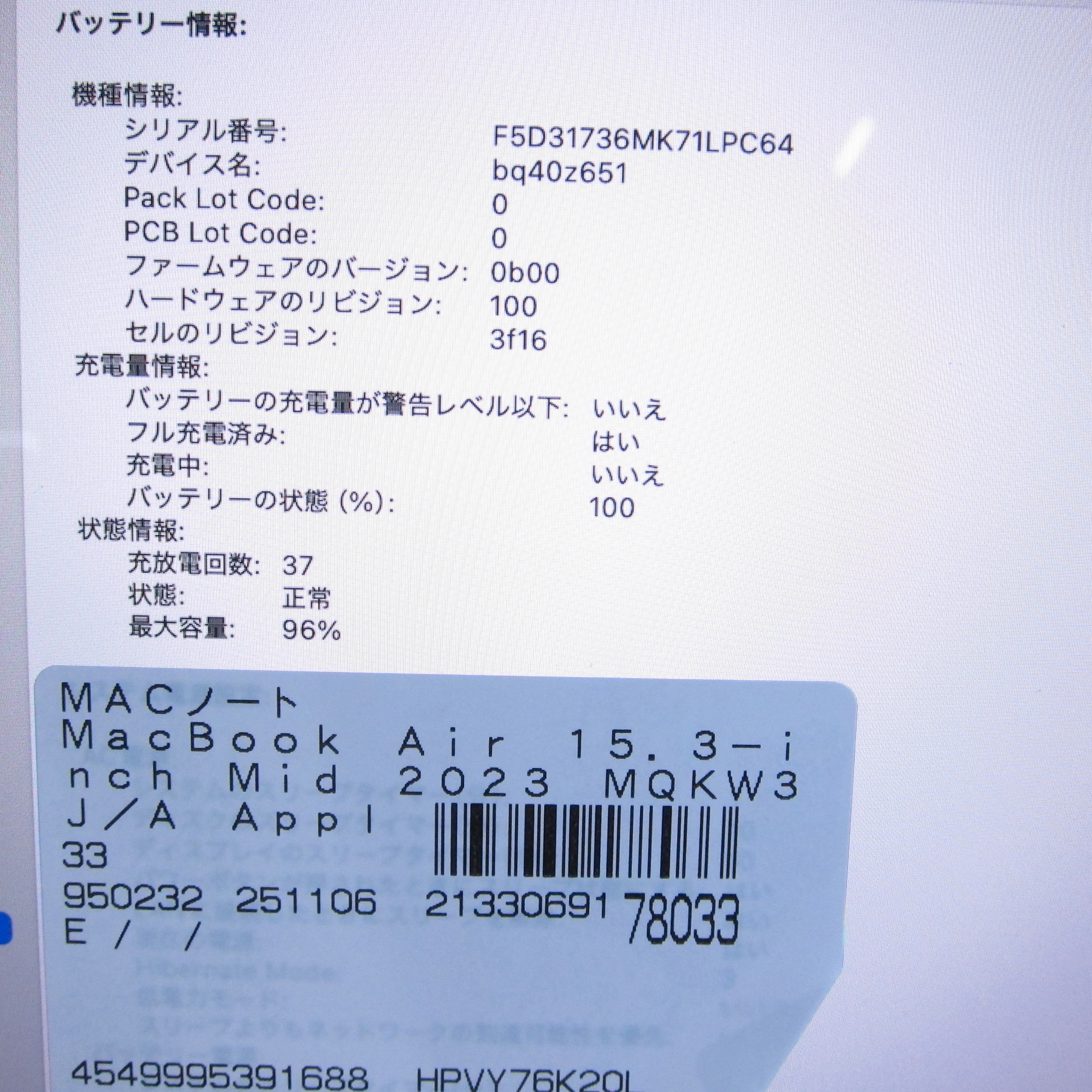 〔中古品〕 MacBook Air 15.3-inch Mid-2023 MQKW3J/A Apple M2 8コアCPU_10コアGPU 8GB SSD256GB ミッドナイト 〔15.3 Sequoia〕 [グラフィック:オンボード/JISキーボード]