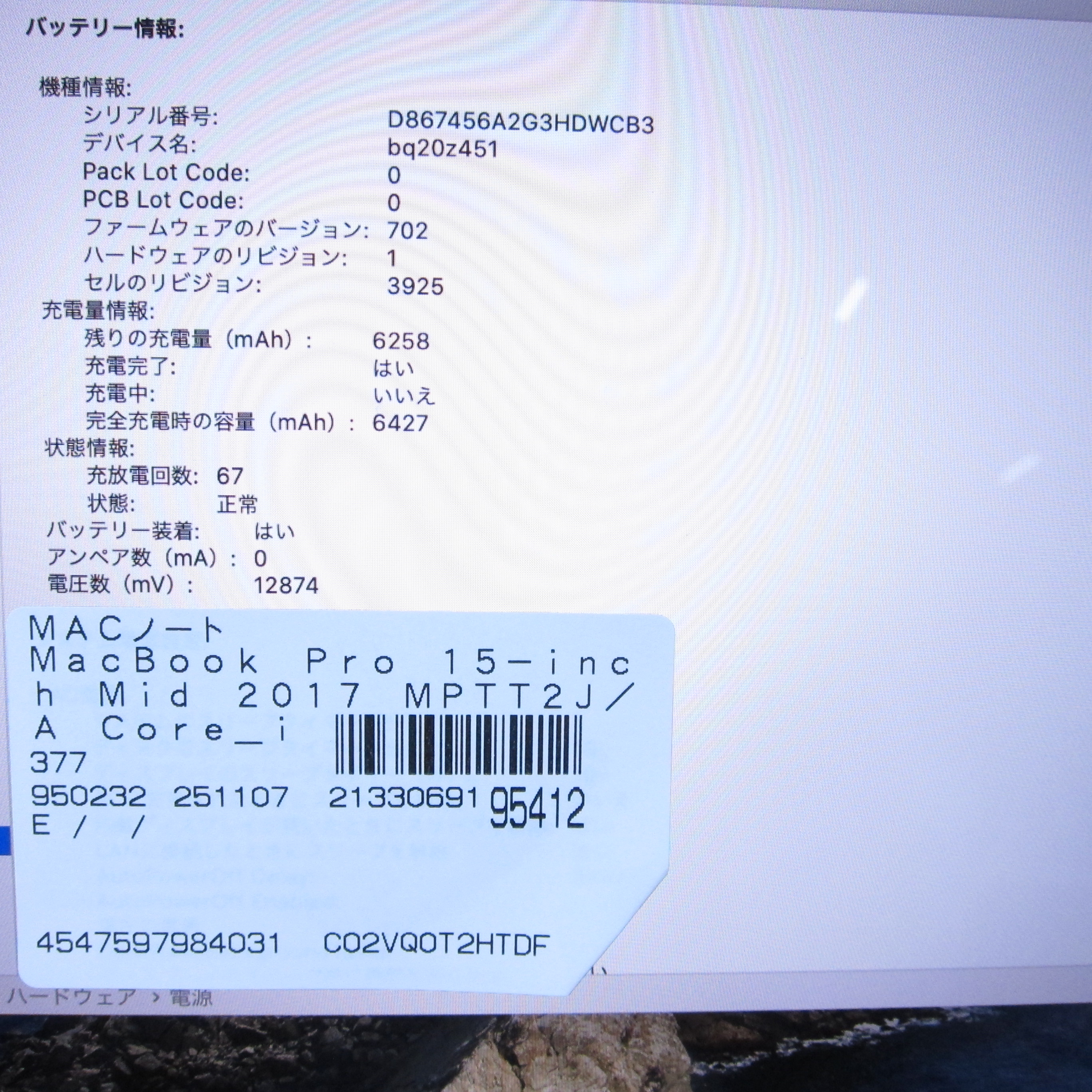 〔中古品〕 MacBook Pro 15-inch Mid-2017 MPTT2J/A Core_i7 2.9GHz 16GB SSD512GB スペースグレイ 〔10.15 Catalina〕 [グラフィック:Radeon Pro 560(4GB)/USキーボード]