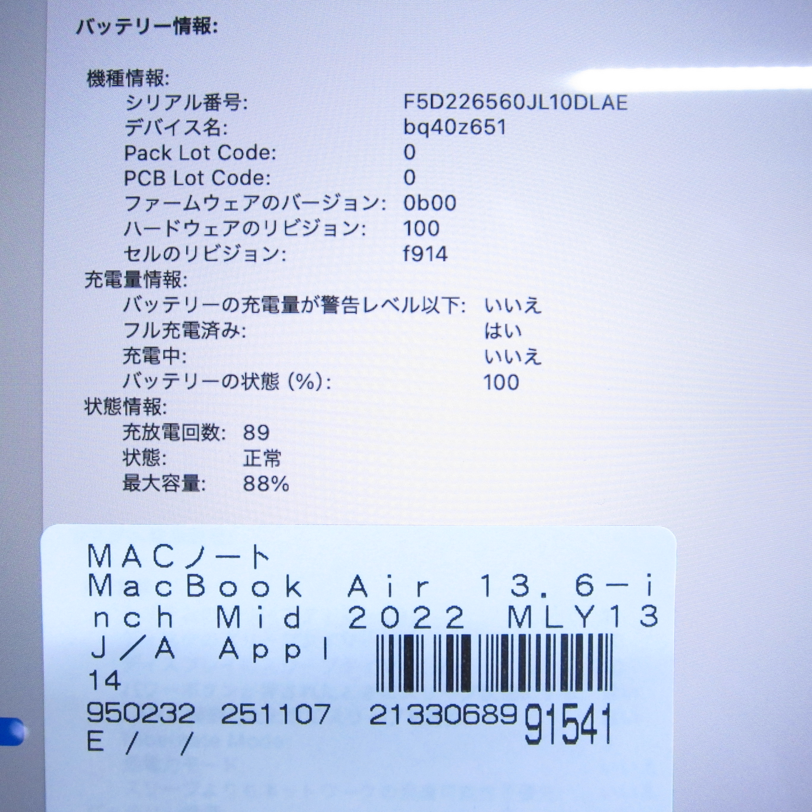 〔中古品〕 MacBook Air 13.6-inch Mid-2022 MLY13J/A Apple M2 8コアCPU_8コアGPU 8GB SSD256GB スターライト 〔15.7 Sequoia〕 [グラフィック:オンボード/JISキーボード]