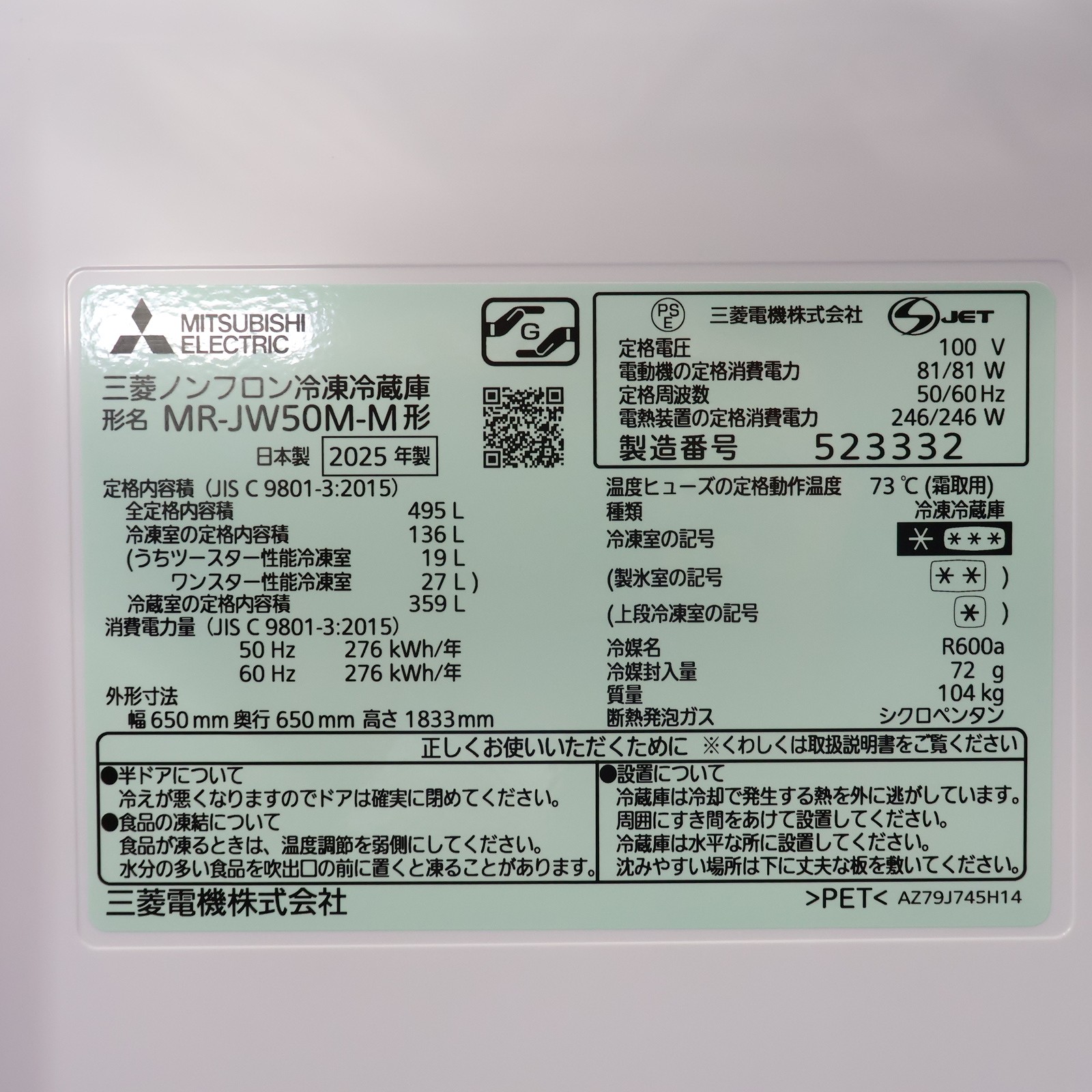 〔展示品〕 冷蔵庫 JWシリーズ ロイヤルウッド MR-JW50M-M [幅65cm /495L /6ドア /観音開きタイプ /2025年]