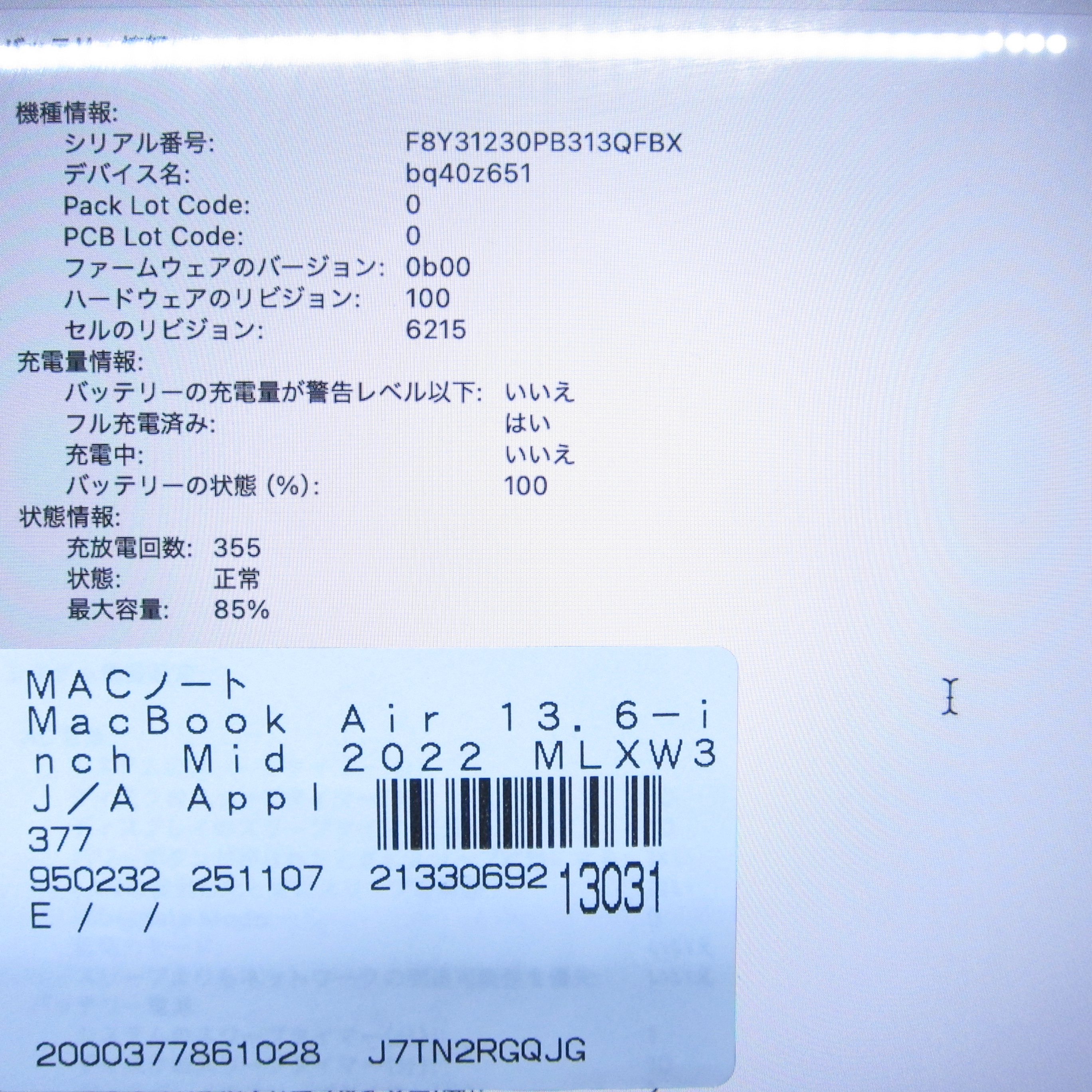 〔中古品〕 MacBook Air 13.6-inch Mid-2022 MLXW3J/A Apple M2 8コアCPU_10コアGPU 24GB SSD256GB スペースグレイ 〔15.7 Sequoia〕 [グラフィック:オンボード/JISキーボード]