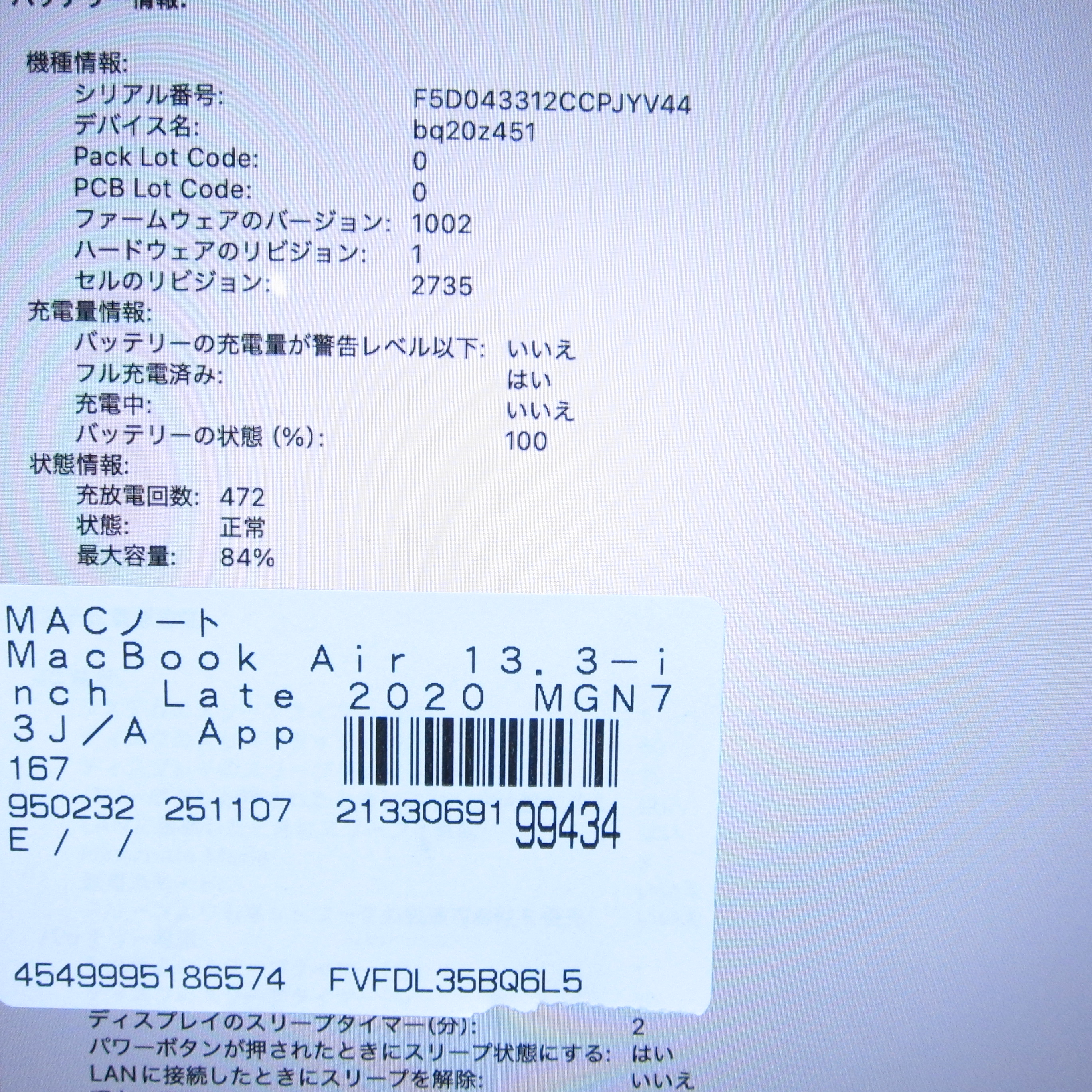 〔中古品〕 MacBook Air 13.3-inch Late-2020 MGN73J/A Apple M1 8コアCPU_8コアGPU 8GB SSD512GB スペースグレイ 〔15.3 Sequoia〕 [グラフィック:オンボード/JISキーボード]