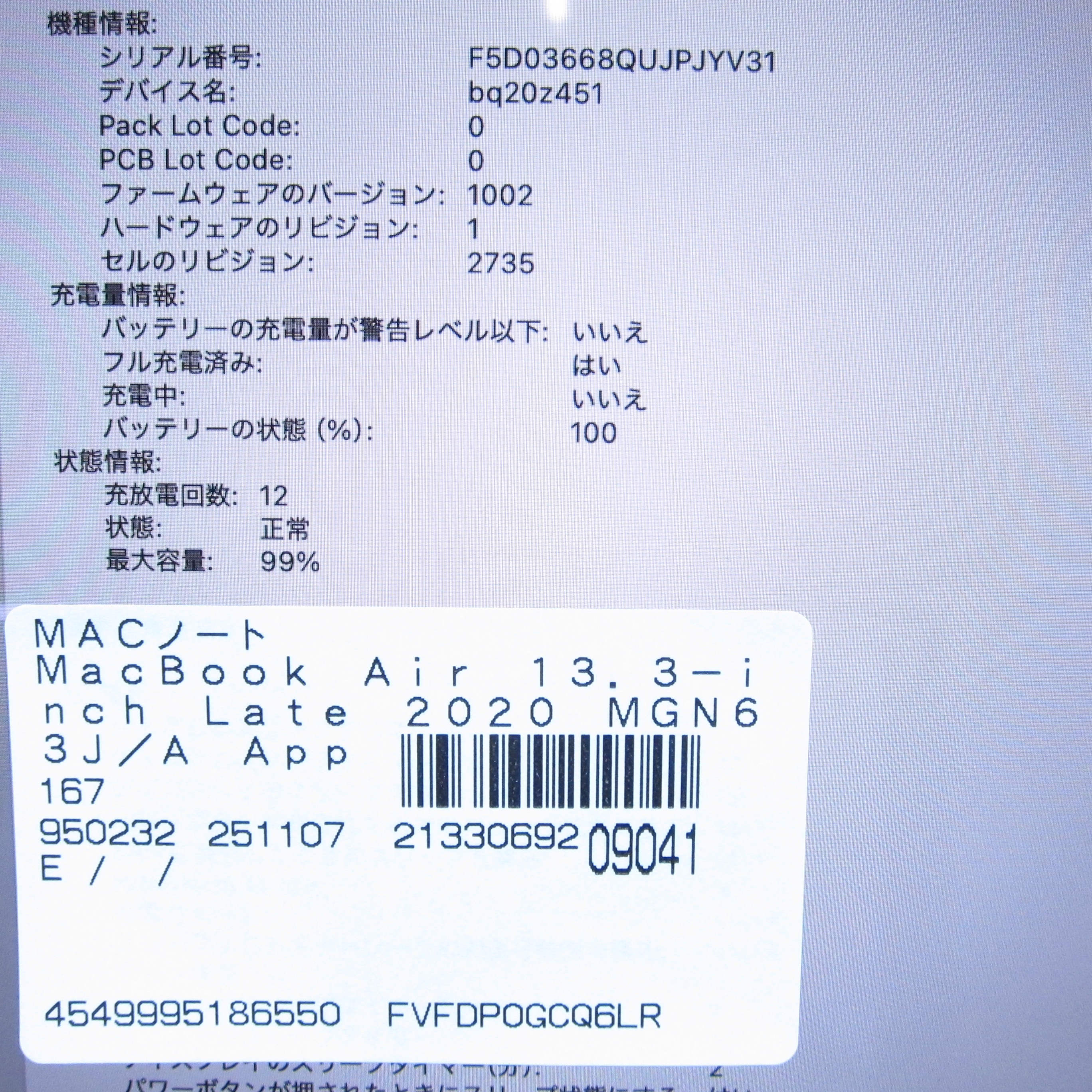 〔中古品〕 MacBook Air 13.3-inch Late-2020 MGN63J/A Apple M1 8コアCPU_7コアGPU 16GB SSD256GB スペースグレイ 〔15.3 Sequoia〕 [グラフィック:オンボード/USキーボード]