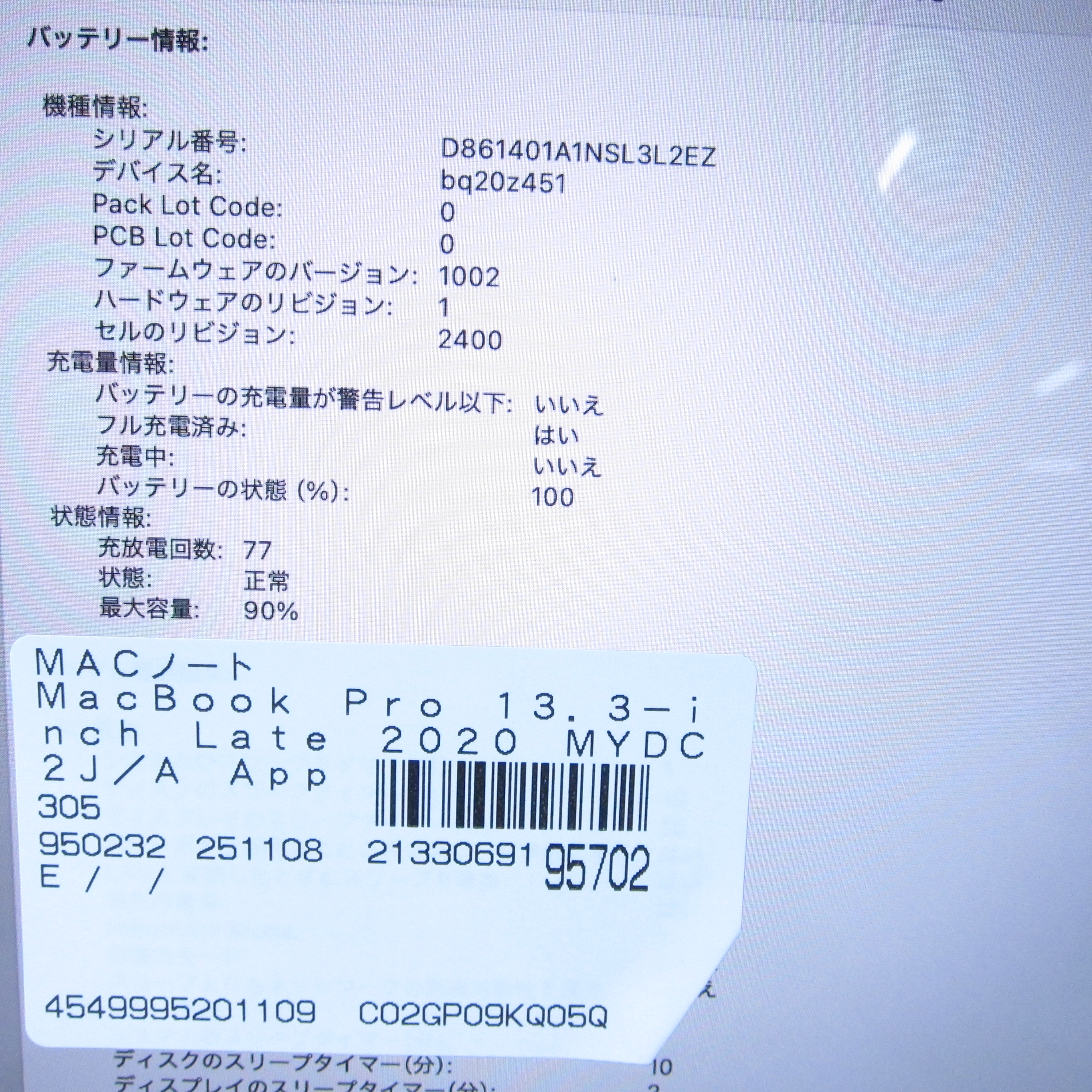 商品名 〔中古品〕 MacBook Pro 13.3-inch Late-2020 MYDC2J/A Apple M1 8コアCPU_8コアGPU 16GB SSD512GB シルバー 〔15.3 Sequoia〕 [グラフィック:オンボード/JISキーボード]
