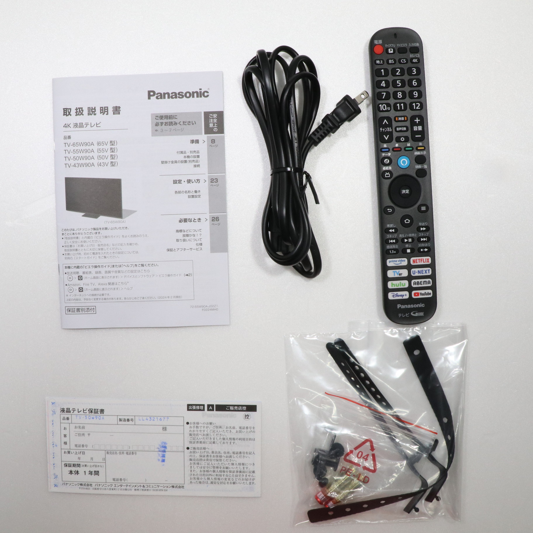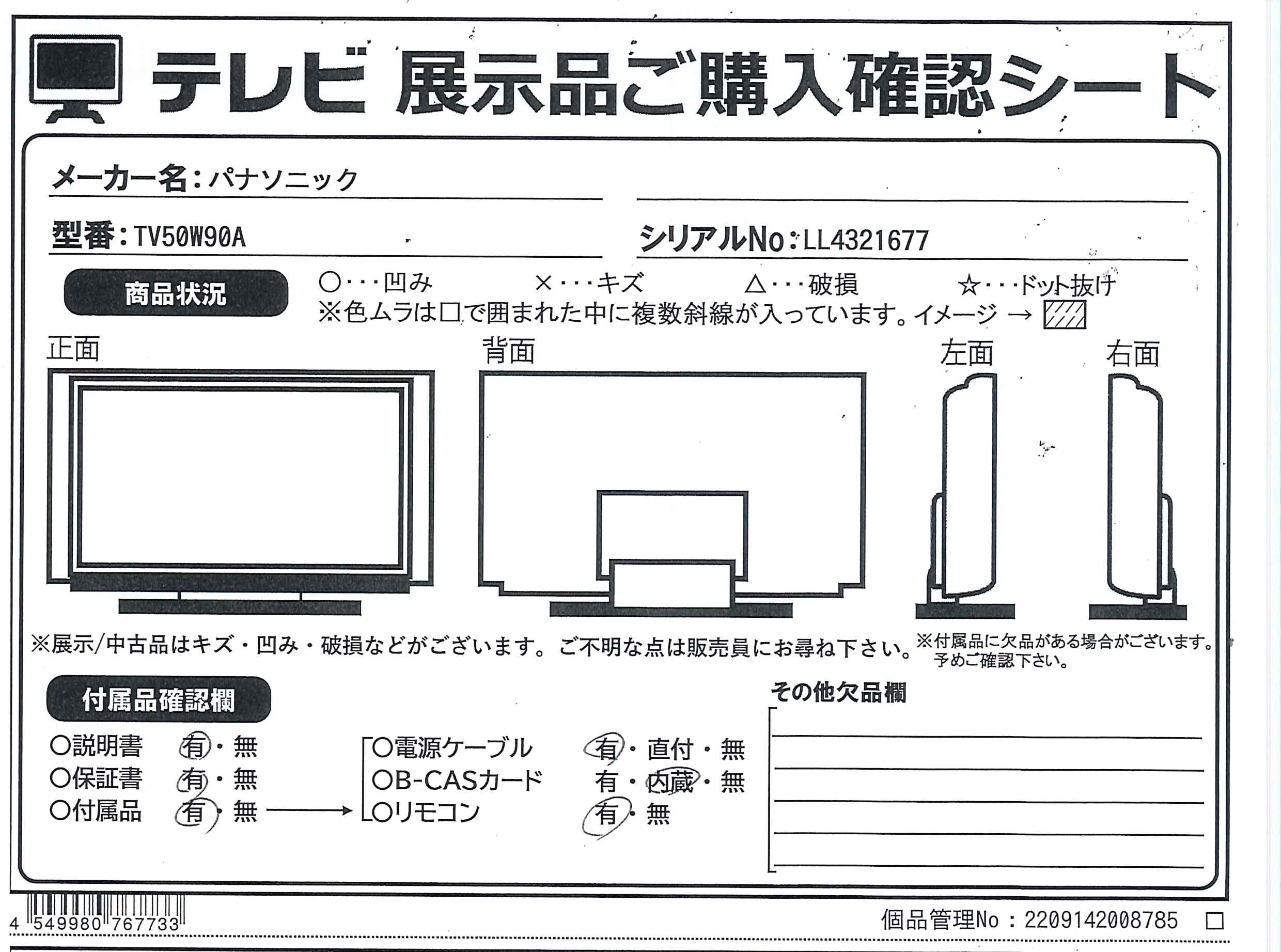 中古商品ランクについて 付属品・商品状態について 〔付属品〕説明書、リモコン、リモコン用乾電池×2、電源コード、スタンド一式、クランパー×2、転倒・落下防止部品一式