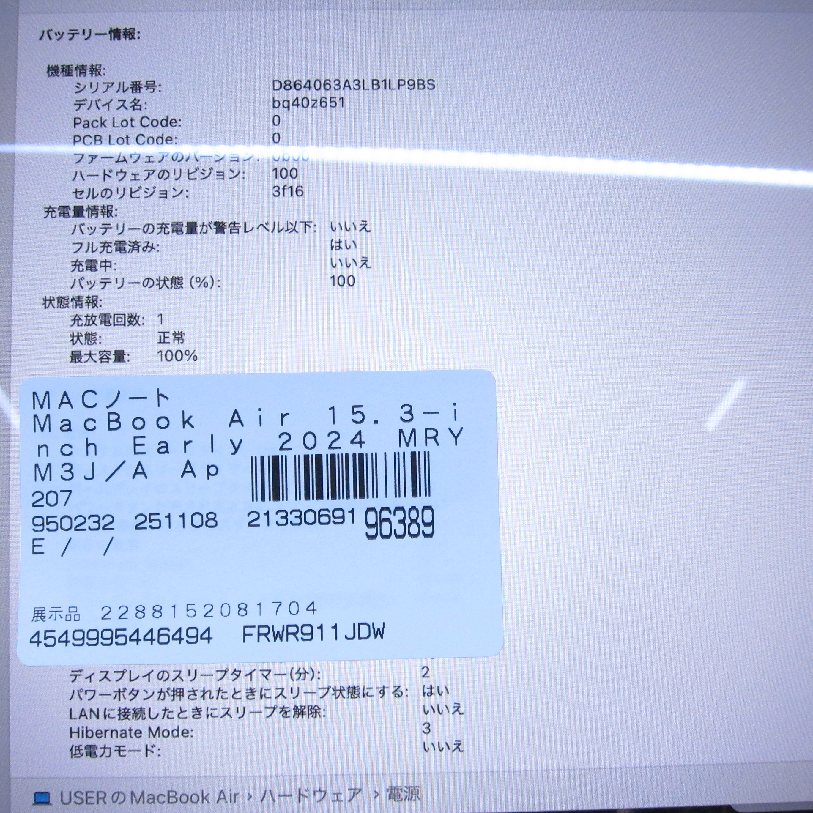 〔展示品〕 MacBook Air 15.3-inch Early-2024 MRYM3J/A Apple M3 8コアCPU_10コアGPU 8GB SSD256GB スペースグレイ 〔15.7 Sequoia〕 [グラフィック:オンボード/USキーボード]
