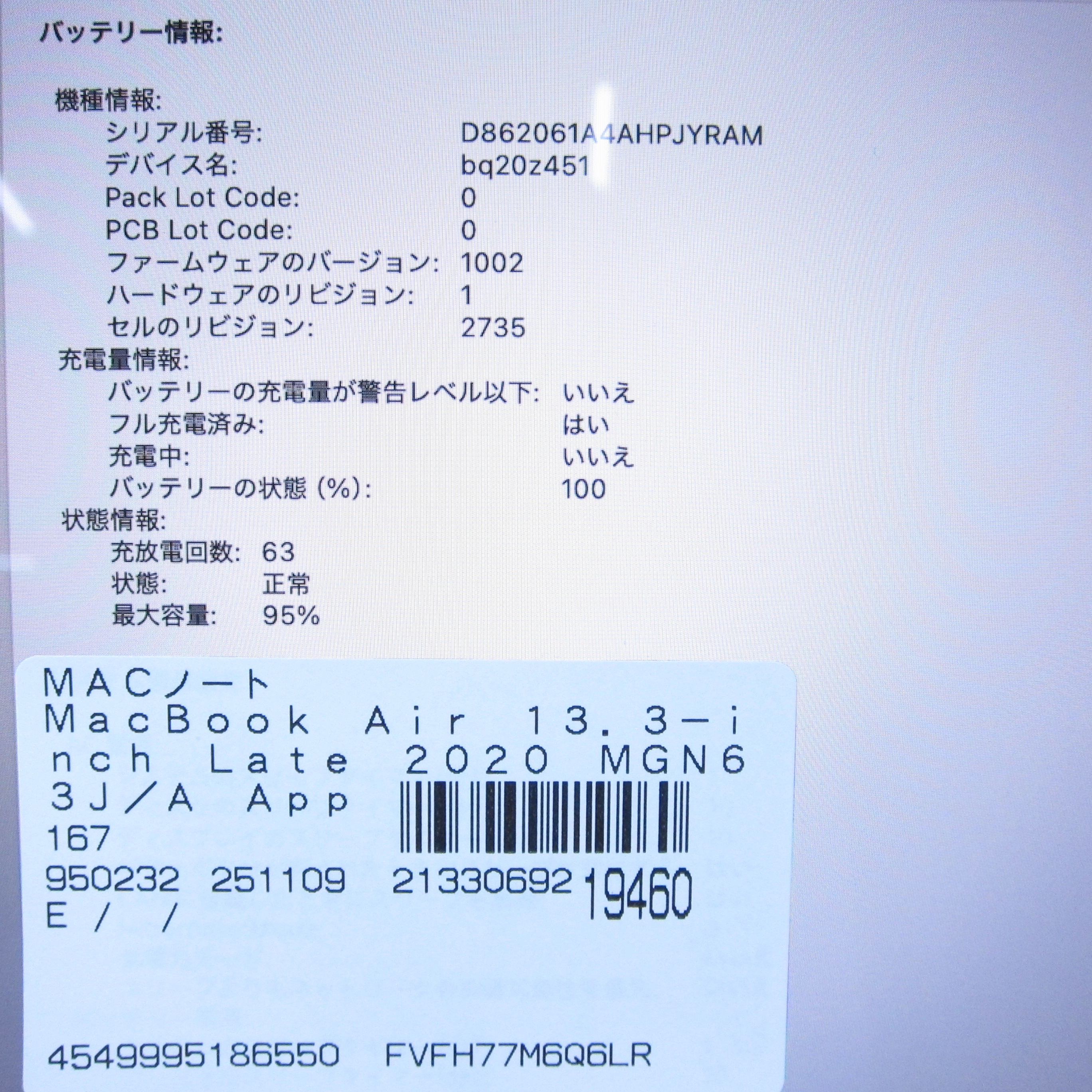 〔中古品〕 MacBook Air 13.3-inch Late-2020 MGN63J/A Apple M1 8コアCPU_7コアGPU 16GB SSD512GB スペースグレイ 〔15.7 Sequoia〕 [グラフィック:オンボード/JISキーボード]