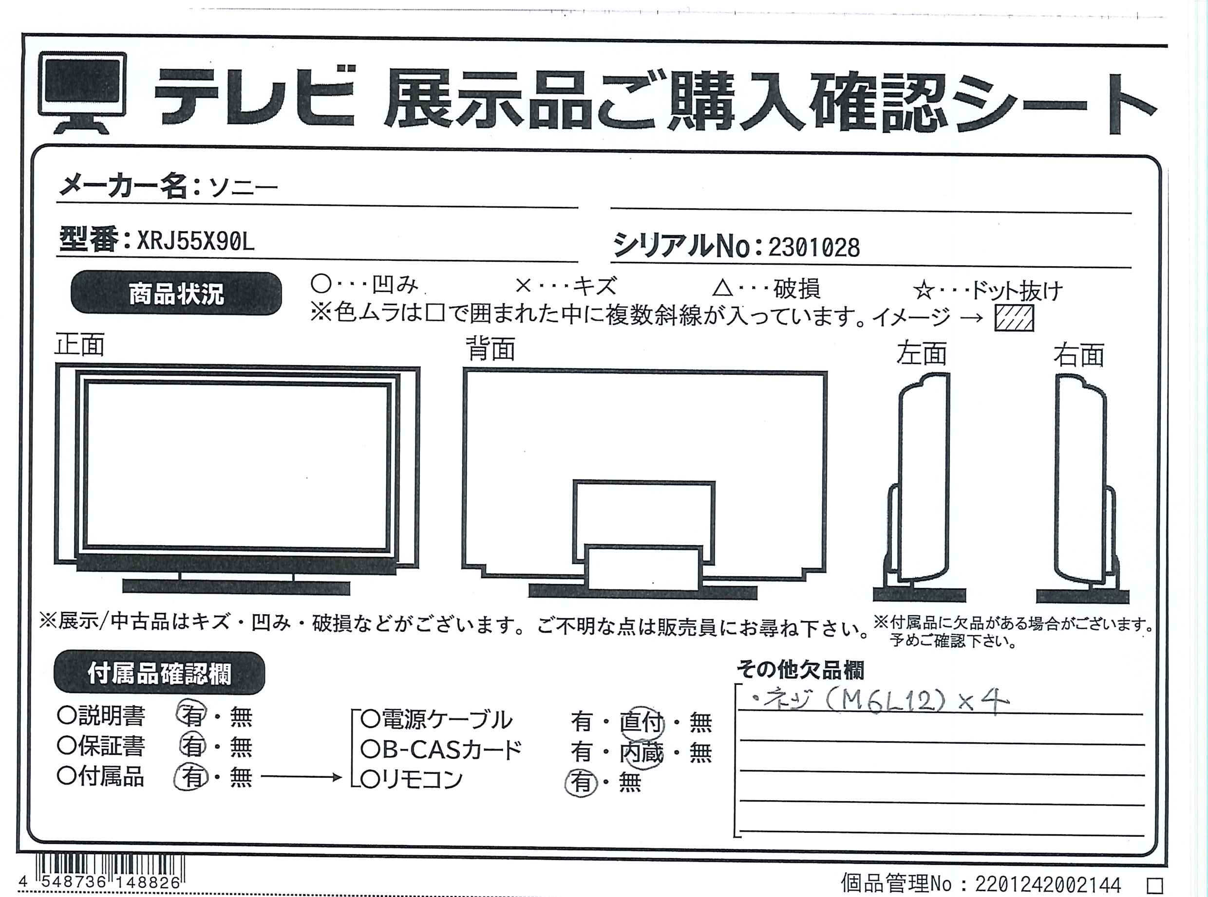 〔展示品〕 液晶テレビ BRAVIA(ブラビア) XRJ-55X90L [55V型 /Bluetooth対応 /4K対応 /BS・CS 4Kチューナー内蔵 /YouTube対応]